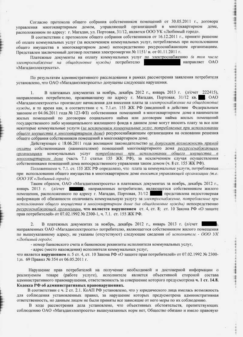 2. Было много ответов с разных инстанций (жильщной инспекции, мэрии, роспотрбенадзора), но самый интересный документ это постановление об административном провонарушении Роспотребнадзора в отношении электросбыта, который я с радостью выложу. Суть документа в том, что выставление счетов за общедомовые нужды элекросбытом незаконно в принципе - это должна делать управляющая компания.