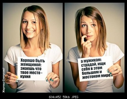 klofelin, и так уже все норм... так сами тетки и виноваты - дорогой, чего у тебя ногти ломаные, пятки шершавые, угорь на морде.., надо вот тебе тоже следить за собой и в косметический салон..., блин.., носки пожалели... тетьки рельсы таскают, мужики в кабинетах маникюрят,так что равенство уже есть, скоро еще =братство= наступит . -------------------- |