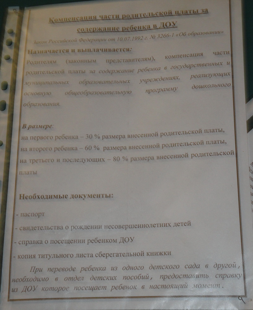 Подскажите пожалуйста, чтобы оформить компенсацию родительской платы за детский сад куда нужно бежать и по какому графику это работает?