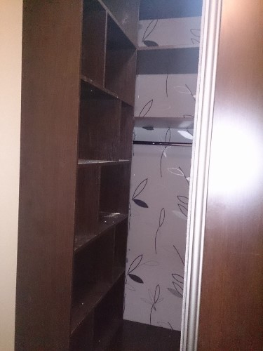 из интересных новинок. Абсолютно одинаковая планировка, двухкомнатная лененградка, ниша в коридоре. В первом случае захотели книжную полку. Очень понравилось. Во втором захотели именно такой шкаф. Особенности этого шкафа, выполнен он не в виде, как принято прямоугольника, а в виде шестиугольной трапеции. К сожалению на фото плохо видно. И вторая особенность, это дверка. Выполнена из алюминиево профиля типа "версаль", но она не сдвижная, а распашная. Заказчики довольны.