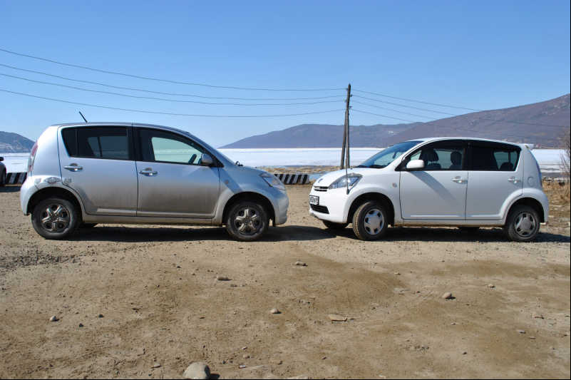 встреча состоялась! на мой взгляд клеринс одинаков. Серая пассо приподнята на 3см зад, 2.5см перед - колёса 165*80*13. Белая пассо приподнята на 3,5 см зад, перед на 3см - колёса 155*80*13