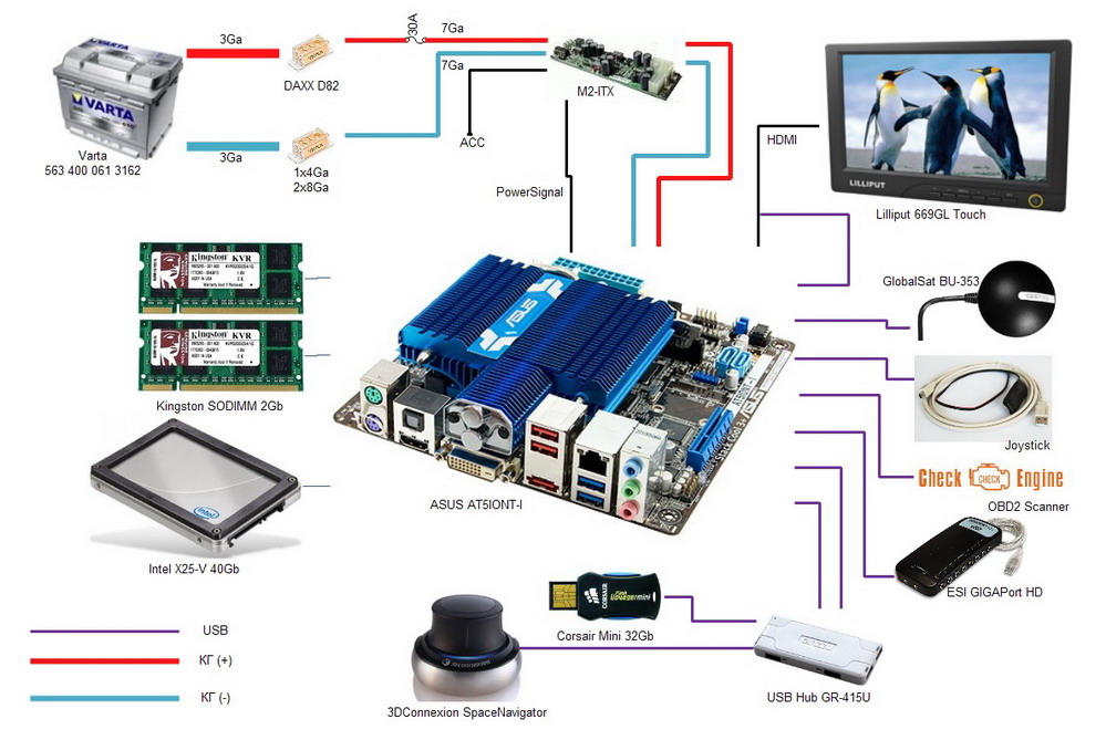 Нужно было определиться что именно, а не ждать пока он сам покажет куда денег потратить…. Путей много … хочется музыки хорошей со всеми вытекающими инсталляциями, хочется ДВС взбодрить, так как имеющихся 220 сил не хватает (в те редкие моменты, когда турбина всё же дует), поставить все распорки по кузову, заменить тормоза на 4pot+2pot путь и не brembo, более производительный интеркуллер и замены маленькой TF035 на что-то более производительное, хорошие стойки, выхлоп, и т.д. Взялся за всё и сразу…. как оказалось зар.плату дают реже, чем появляются интересные лоты, да и семью кормить надо…. Начал с давней идеи CarPC, так как multitronicsa, опробованного ещё в Карине, явно не хватало для мониторинга ДВС, еле переваривающего наш бензин…. да и в музыкальном направлении тоже PC не помешает… нашел примерную схему, вроде не сложно Начинаем закуп, в Магадане найти что-то сложно, поэтому запасаемся терпением и надеждой на почтуРоссии 1)БП я взял помощнее - M4-ATX (4300руб. с пересылкой) 2)материнка ASUS AT5IONT-I на борту Atom D525 и nvidea ION +4Gb RAM + SSD OCZ Vertex 30Gb (10300руб.) 3)монитор BS8, взял китай на сайте в Благовещенске, выслали EMS из Китая на мой адрес, пришел быстро, качество отличное, только нет лейбы, а нафига за неё ещё 5тыс.руб. сверху доплачивать? (6500руб. с пересылкой) Копус соорудил из алюминиевого уголка, с его же помощью был закреплен монитор в торпеде Вот так выглядел комплект, так сказать «под ключ», место установки и готовый вид Куллер был заменен на подходящий по размеры и более эстетический на вид, за что спасибо Торонага и добавлена беспроводная мышь, так как на экран в мелком разрешении и на ходу попадать сложно… Так же был приобретен OBDII сканер ELM327 (до сих пор не подружил его с компом субары) и следом заказал другой шнурок VAG-COM k-line адаптер KKL… Сообщение отредактировал owl - 1.6.2013, 20:21 -------------------- обменяю 2-х комнатную квартиру в Магадане на Виллу на Северном Кипре!!!