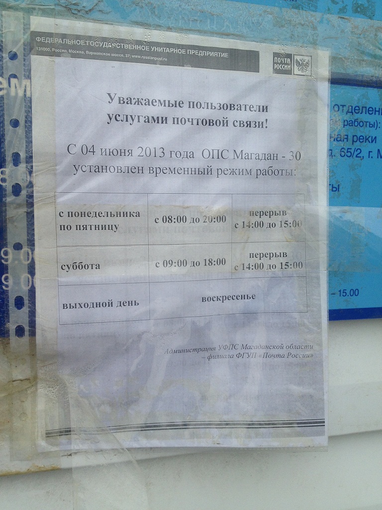 Подскажите, как щас работает 30-е отделение связи? Интересует окошко выдачи посылок, ессно ))) В воскресенье выходной. Спасибо! — Basya