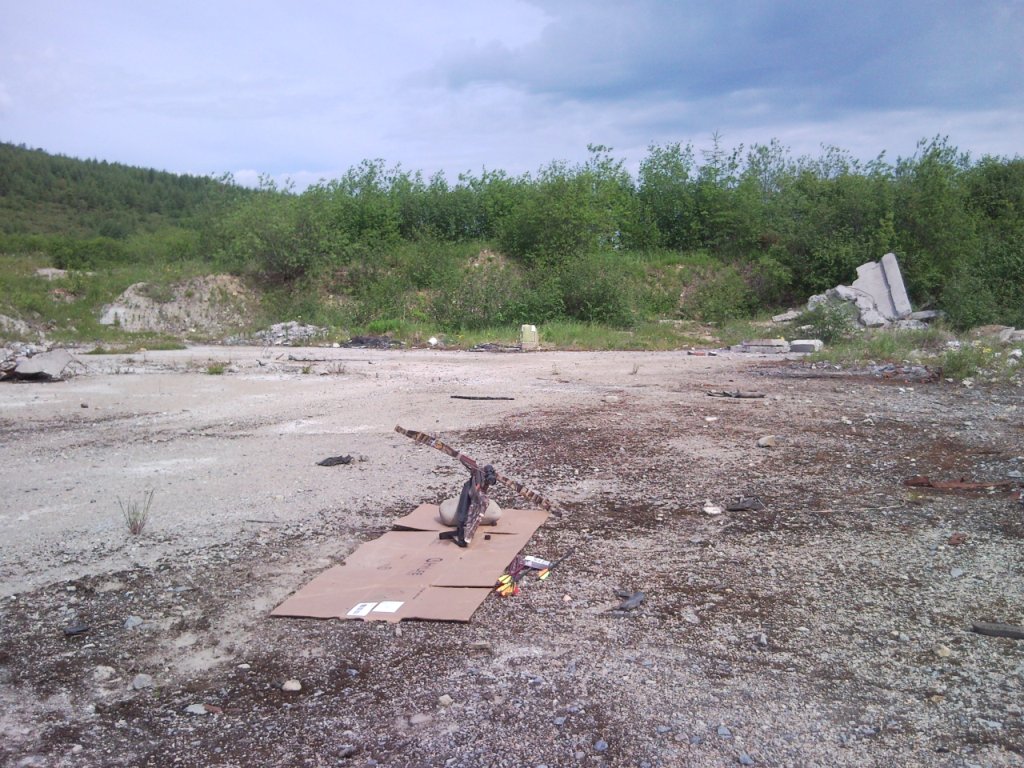 По мишени. Была использована коробка из под яиц набитая лотками, картоном и кусками ленолиума найденного на Горняке в развалинах. На нее и крепил грудную мишень. Все понравилось. с удовольствием повторю в компании с другими участниками. Соберемся?