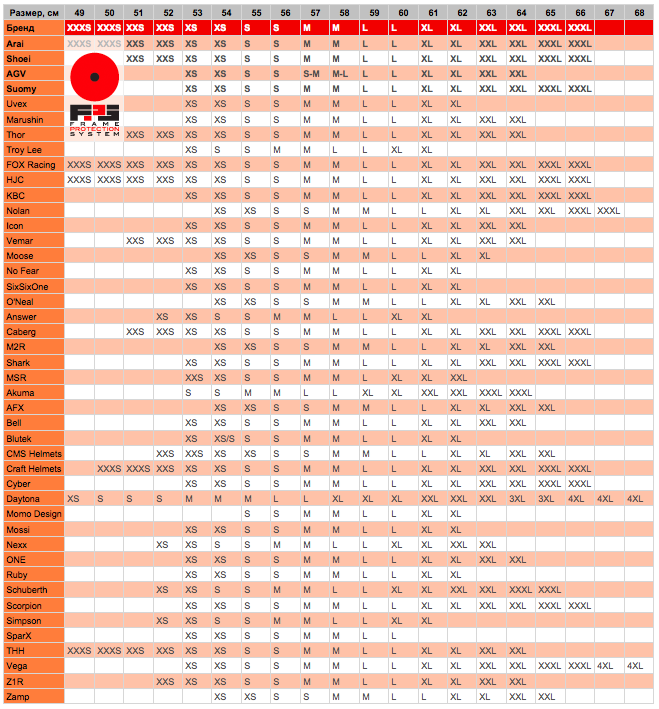 Таблица соответствия размеров шлемов,достаточно много брендов охвачено.