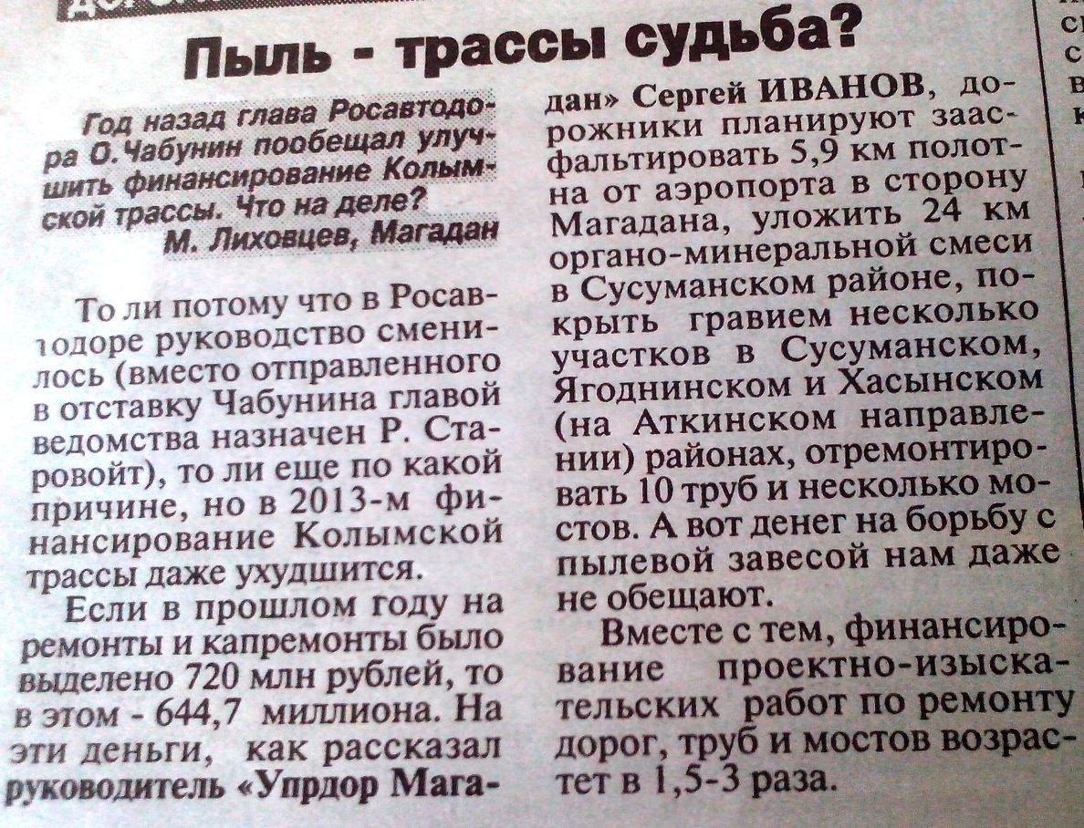съездил на днях в аэропорт- два задних баллона на выброс,две грыжи! рассчитывал на них ещё на пару сезонов отездить. влетел в "дырку" между Соколом и Уптаром... от этой бесячей поездки второй день отхожу,чуть не убился... я то думаю, чёй-то народ по обочине ездит. а я самый умный по бетонке, как в ПДД накорябано... а на бетоне,точнее на том что на нём осталось - такие приветы от дорожников! давно я такого состояния трассы не видел-повсюду люльки и дырки. везде знаков понытыкали заместо ремонта...домой приехал и прочёл данную статью в магаданской вкладке "Аргументов и фактов". фото прилагается.