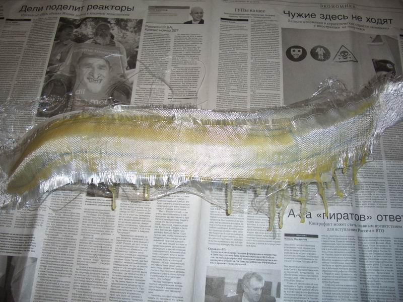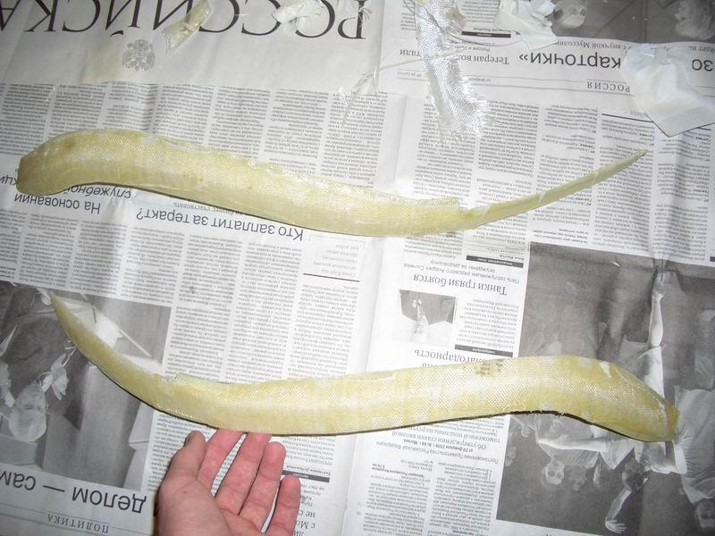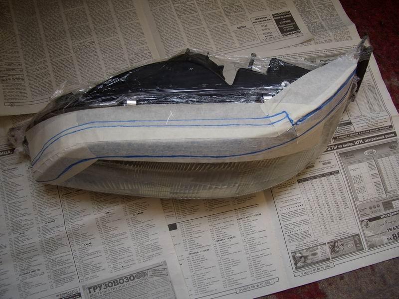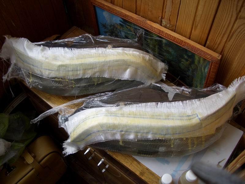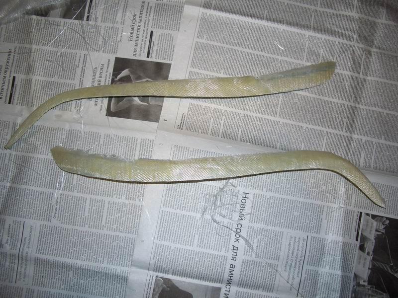 Изготовить реснички самостоятельно меня заставило то, что при первой встрече с ними появилась мысль: что же тут сложного в изготовлении? И после изучения различных статей о том, что большинство форумчан лепит ресницы и обвесы из стеклоткани, решено было попробовать сделать что-то самому, тем более что надо было полировать фары, помутневшие от времени и грязи. Также, надо было повернуть лампы, дабы не слепить встречный поток. Часть 1: изготовление ресниц Для изготовления ресниц нам понадобится: 1. Стеклоткань (я купил кусок 2*1 м, реально, погонного метра за глаза хватит) 2. Эпоксидная смола (в общей сложности у меня ушло 400 мл) 3. Скотч широкий малярный (заклеить то, куда будем клеить стеклоткань) 4. Перчатки резиновые медицинские (я покупал 3 пары, ушли все) 5. Дешевая плоская кисть (перемещать эпоксидку из стаканчиков на фары) 6. Стаканчики для смолы (простые пластиковые подойдут) 7. Пленка пищевая (фары завернуть, чтобы не заляпать) 8. Фломастер или маркер (для того, чтобы контур нарисовать) 9. Шпаклевка (я взял баночку Body 250 грамм, осталось даже) 10. Грунт под покраску 11. Руки, желательно прямые, в количестве 2 штуки 12. Ну и огромное желание все сделать Шпаклевку и грунт можно не покупать, если вы не собираетесь готовить ресницы под покраску самостоятельно. Сначала, естественно фары с автомобиля были сняты, и доставлены домой. Фара После чего были аккуратно вымыты снаружи, и высушены. После того, как фары полностью высохли, я обернул их в целлофан (чтобы не заляпать смолой корпус и стекло), и по верхней кромке фары (там, где должны быть ресницы) заклеил малярным скотчем, чтобы было видно куда клеить. После этого нарисовал маркером контур будущих ресниц. Я решил не заводить их на поворотники, а сделать с небольшим волнообразным загибом у краев фары. Подготовленная фара Следует также заранее разрезать стеклоткань на куски, разрезаем с запасом, отрезать можно всегда, а так обидно может быть, когда не хватит какого-то миллиметра. В общем, все приготовлено, и разложено на балконе. Все готово, можно начинать Сперва необходимо надеть средства защиты кожи рук (перчатки), и вообще все работы с применением эпоксидки проводить в перчатках, руки целее будут. Разводим эпоксидную смолу в подготовленном стаканчике, у меня были упаковки по 100 грамм, лучше сразу развести 1.5 пузырька, этого хватит на 2 фары, на первый слой. Тщательно перемешиваем смолу и отвердитель. Смола в процессе разведения После того, как тщательно все перемешали, намазываем фару смолой, слой толщиной около 1-2 мм. Фара 2 После этого кладем первый кусок предварительно отрезанной стеклоткани, и разглаживаем его, сначала руками (складок на ткани быть не должно), а затем пустым пузырьком от смолы раскатываем. Первый слой Аналогично поступаем со второй фарой, и обе фары оставляем на сутки, пока смола не полимеризуется полностью. На следующий день, повторяем операцию, кладем второй слой смолы+стеклоткань. Делаем все точно также. Второй слой На следующие сутки, когда все окончательно высохло (2 слой, высохло), отделяем нашу конструкцию от фары, (кусок, отделенный) и обрабатываем по контуру, отпечатавшемся на смоле, обыкновенными бытовыми ножницами Что-то получается Также поступаем со второй фарой: отделяем, обрезаем. Итак, получилась альфа-версия ресниц: альфа-версия. Но конструкция оказалась хлипковата, и я реш