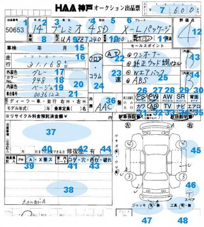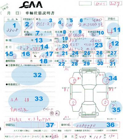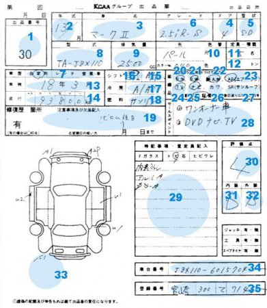 Расшифровка аукционного листа USS. Аукционная сеть USS (Used Car System Solutions) 1. номер лота 2. история (слева направо через точку): частное использование * аренда * что-либо другое 3. объем двигателя 4. марка кузова 5. год/месяц первой регистрации 6. модель 7. тип кузова, число дверей 8. модификация 9. аукционная оценка: - S и 6 - практически новый автомобиль в идеальном состоянии; разница в дате первой регистрации, но не старше 3-х лет - 5 - автомобиль в отличном состоянии с пробегом менее 60000 - 4,5 - автомобиль в очень хорошем состоянии, может иметь малозаметные дефекты кузова, легко устраняемые небольшим косметическим ремонтом - 4 - автомобиль в хорошем состоянии, но без четких ограничений по возрасту и пробегу; может иметь небольшие дефекты кузова - 3,5 и 3 - автомобиль в удовлетворительном состоянии, но с заметными дефектами кузова; салон, как правило, нуждается в чистке или ремонте; возможно, производился ремонт с заменой узлов или деталей кузова - 2 и 1 - автомобиль в плохом состоянии, требующем серьезного ремонта - R, R1, RA и т.п. - автомобиль, восстановленный после аварии, либо подвергшийся существенным переделкам с заменой штатных узлов и агрегатов на нестандартные - *** - восстановлению не подлежит 10. оценка состояния салона A - идеальное состояние B - салон в хорошем состоянии; соответствует баллу 4 и 4,5 C - состояние салона посредственное; применяется, как правило, с оценками 3 и 3,5 11. срок действия сякэна 12. пробег в километрах (вверху) или милях (внизу) 13. оригинальный цвет кузова 14. цвет кузова, если автомобиль был перекрашен 15. номер цвета 16. топливо (слева направо через точку): бензин * дизтопливо * какое-либо другое 17. цвет салона 18. какого года модель 19. трансмиссия 20. кондиционер 21. гарантия: есть * нет 22. срок действительности документа 23. вместимость салона 24. грузоподъемность 25. люк 26. легкосплавные диски 27. усилитель руля 28. электростеклоподъемники 29. подушки безопасности 30. навигация 31. телевидение 32. кожаный салон 33. отличительные черты и особенности автомобиля, на которые продавец хотел бы обратить внимание при продаже 34. регистрационный номер 35. номер шасси 36. дополнительные отметки эксперта 37. отчет эксперта 38. дефекты кузова 39. запасное колесо Расшифровка аукционного листа LAA Аукционная площадка LAA (Light Auto Auction) Расшифровка аукционного листа KCAA. 1. номер лота 2. год/месяц первой регистрации 3. модель 4. число дверей 5. тип кузова 6. модификация 7. история: частное использование | аренда | что-либо другое 8. марка кузова 9. объем двигателя 10. цвет кузова; внизу: номер цвета; справа: оригинальный цвет, если кузов перекрашивался 11. вместимость салона 12. грузоподъемность 13. срок действия сякэна 14. пробег в километрах 15. трансмиссия 16. расположение органов управления трансмиссии (сверху вниз): на полу | на рулевой колонке 17. кондиционер 18. используемое топливо 19. служебные отметки 20. усилитель руля 21. электростеклоподъемники 22. легкосплавные диски 23. подушки безопасности 24. телевидение 25. навигация 26. кожаный салон 27. люк 28. отличительные черты и особенности автомобиля, на которые продавец хотел бы обратить внимание при продаже 29. дополнительные отметки эксперта 30. аукционная оценка 31. оценка состояния салона 32. оценка внешнего состояния 33. дефекты кузова 34. номер шасси 35. регистрационный номер Расшифровка аукционного листа KCAA Аукционная группа KCAA (Kyushyu Chuo Auto Auction) 1. номер лота 2. год/