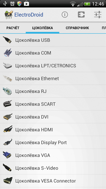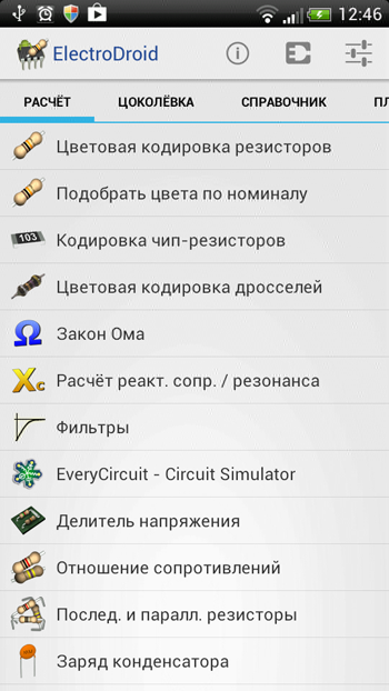 ElectroDroid Pro. Довольно продвинутый справочник для радиолюбителя. Справочник состоит с трех вкладок: 1. Расчёт: Цветовая кодировка резисторов. Цветовая кодировка дросселей. Закон Ома. Делитель напряжения. Отношение сопротивлений. Послед. и паралл. резисторы. Заряд конденсатора. Операционный усилитель. Резистор для светодиода. Расчет LM317. Тепловой режим. Время работы батареи. Расчёт катушки индуктивности. 2. Цоколёвка: Цоколёвка USB. Цоколёвка COM. Цоколёвка LTP/CETRONICS. Цоколёвка Ethernet. Цоколёвка SCART. Цоколёвка DVI. Цоколёвка HDMI. Цоколёвка VGA. Цоколёвка S-Video. Цоколёвка Jack. Цоколёвка FireWire. 3. Справочник: Таблица сопротивлений. AWG и SWG размеры провода. Таблица резисторов. Таблица конденсаторов. Маркировка конденсаторов. Символы и обозначения. Сообщение отредактировал kosmag - 6.2.2016, 12:54