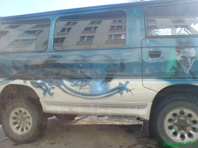 Вот, стою я както наднях (позавчера вроде) солнышко было такое приятное, летнее. хорошо. Вроде 15ый магазин ... стекляшка на Шимича что возле ДК в Автотеке, кручу бошкой и вижу.... ого... чтото новенькое... делика стоит и блестит аэрографией на тему матрицы. Стою жду товарищя, и кокрас подходит хозяин Делики, открывает её и тут я его спрашиваю ... привёз такую или тут рисовали ? он говорит -да вот тока с гаража, внизу видиш, подтёки ещё не стёрли. пока ещё не дорисовали, не запалировали. Смотерлось скажу я вам эффектно. Рисует мужичёк гдето в гаражах на Шимича за железным мостиком. Мужик на Делике уехал а про взять телефон художника я забыл ... зато успел сфотать. солнца много но чёто видно =)