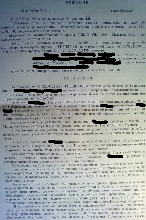 Пишут чёрным по белому "оснований для проверки спец.прибором светопропускаемости не имелось"!А как они мать так на глаз "законно" определяют что пропускаемость не соответствует ГОСТу?или вышло постановление что приборы теперь не нужны?