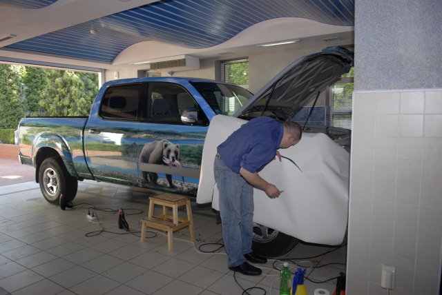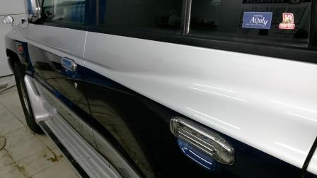 Плёнка под хром может быть использована для восстановления внешнего вида металлических деталей кузова. Для защиты свежего слоя ЛКП, в том числе и с нанесенным винилом, с успехом применяется жидкое стекло - японский продукт фирмы Акли (Aquly). Процедура нанесения проста и в случае с джипом на фото стоит 7500 р. После нанесения средства кузов приобретает дополнительный защитный слой твердостью 6Н (8H max), который великолепно справляется с песком, грязью, снегом, реагентом, не давая прилипнуть к кузову. Средство не боится температур ниже 30 градусов, не "отшелушивается" и сохраняет свой блеск от 1 до 3 лет. Наносить средство можно также на пластиковые детали а также на стёкла и даже литые диски. -------------------- Мастерская винилового тюнинга