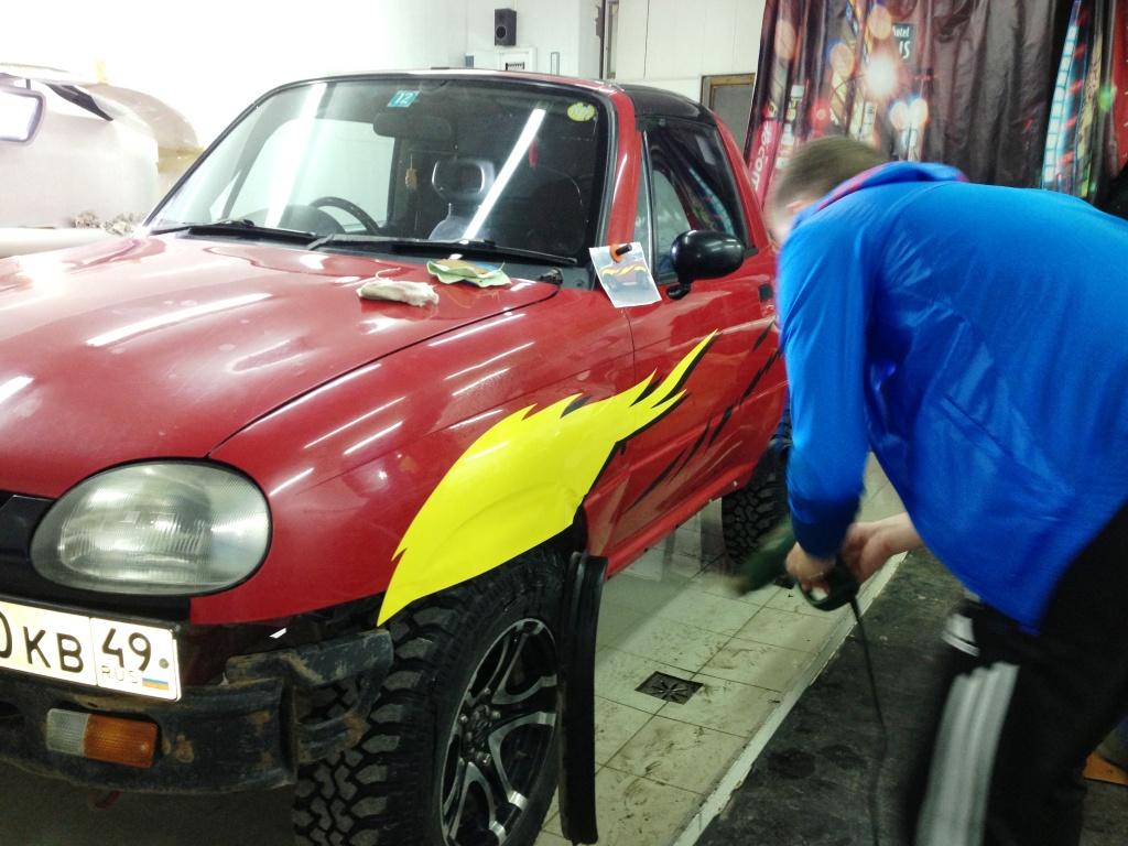Кто видел мультик про тачку Молнию Маквин? =) такой вот вариант стилизации особого типа внедорожника, где использовались плёнки высшей категории сроком службы до 10 лет. Общая стоимость работы - 7 000 рублей! По всем правилам в конце работы весь контур винила по обеим сторонам был обработан бесцветным лаком, препятствующим попаданию влаги под края плёнки. Уменьшено до 91%ссылка доступна только зарегистрированным1024 x 768 (105.93 килобайт) Уменьшено до 91%ссылка доступна только зарегистрированным1024 x 768 (94.66 килобайт) Можно было бы использовать для обрамления жёлтый светоотражающий материал, но стоило бы это уже около 11 000 ру Моя тачка! Все сделано на совесть, пока не отклеилась! Вот только для капота время так и не нашли... Спасибо! — Vinyl Deluxe