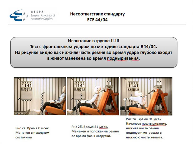 В начале декабря прошла 50я конференция UNECE – Европейской ассоциации дорожной безопасности (GRPS), на которой были представлены результаты тестирования накладки на автомобильный ремень ФЭСТ, а также надувного детского сидения безопасности. Оба изделия были признаны несоответствующими основному стандарту безопасности R44/04, а представители Франции и Германии рекомендовали исключить данные изделия из списков одобренных устройств детской безопасности, что означает запрет на их продажу и использование в этих странах. -------------------- |