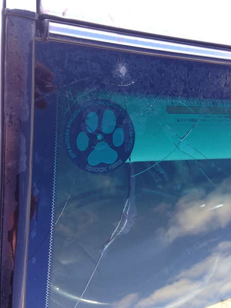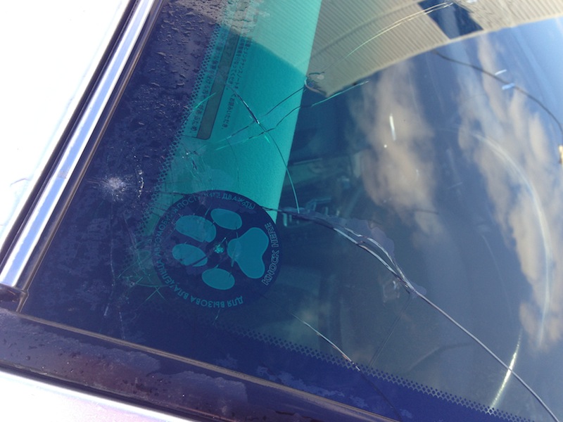 Вчера днем-часа в 3-жена зашла в комнату и сказала,что у меня сигналка пикает!взял сигналку-на ней датчик удара показан!выглянул в окно-все ровно-у машины никого нет!вечером машину отогнал в гараж!сегодня днем пошел за машиной-пока прогревалась я залез в салон музычку послушать ну и наклонился к рулю!глаза поднял, а из под козырька(они у меня в сторону лобового откинуты) трещина ползет!вылез из авто поглядеть, а сразу над козырьком паутина круглая и в центре круглый скол! Жена сказала,что во дворе гопота бегала с питардами ну и возможно с пневматом! больше и думать не на кого-т.к. с соседнего дома стрельнуть не могли-стояла на торце дома!а с моего-пуля бы полукругом должна была лететь! Автомобилисты с ул. Берзина-бдите-сволота даже днем не дремлет |