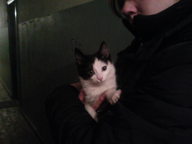 Я уже говорила, что мне везет на всех несчастных? Так вот, у подруги в подъезде кошка принесла котят, было двое, сейчас остался один котенок (вроде бы девочка), красивая и ласковая, маленький мурчащий трактор, намурчала мне на ушко, что очень хочет хороших, добрых хозяев. На вид котенку примерно месяц. Веду работу с мужем, но даже на передержку пока не соглашается. В принципе, кошки живут там в секции, спят на коляске, им подстелили покрывало, подкармливают, но маленький котенок бегает по подъезду в поисках ласки и тепла. Бегает - мявкает. Взяла на руки - притихла и замурчала.