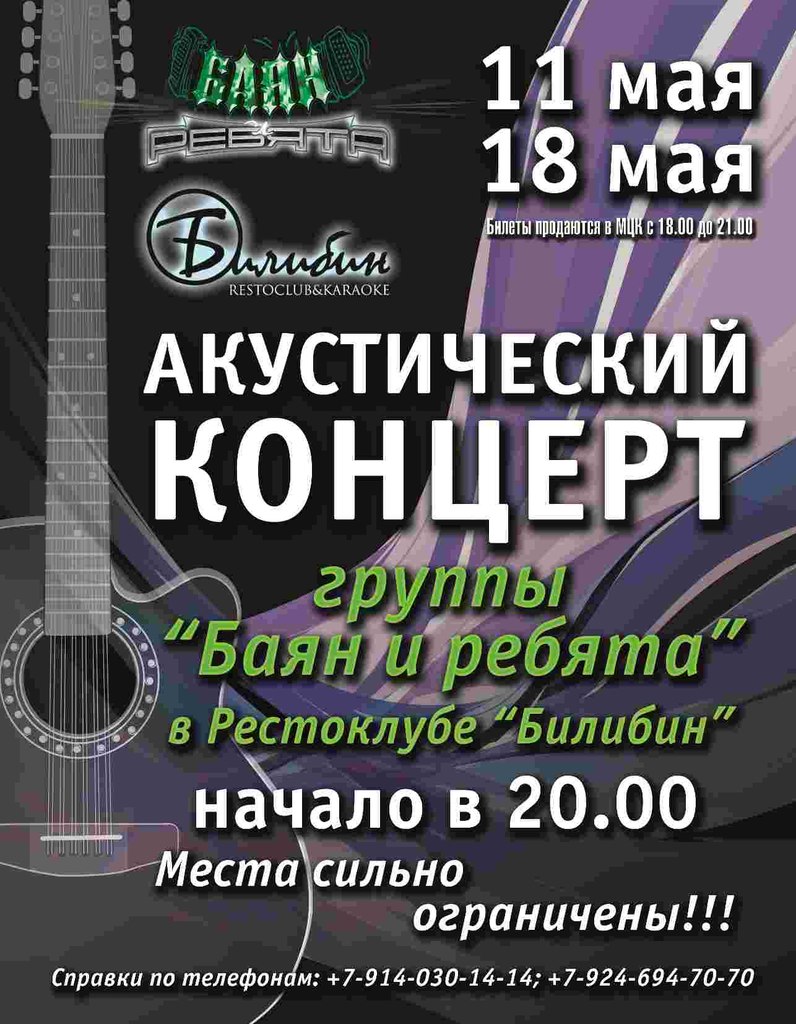 11 и 18 мая 2014 года группа "Баян и ребята" дает акустические концерты в караоке-зале рестоклуба "Билибин"!!!