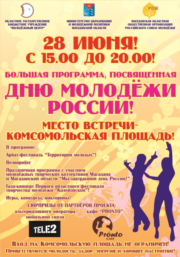 В 15.00 28 июня 2014 года начнет свою работу арбат-фестиваль «Территория молодых», на котором более 30 молодежных коллективов представят себя. Среди них: танцевальный центр «ONLINE», группа капоэйры «Эсперанза», областная мотоциклетная федерация, военно-исторический клуб «Братина», группа «Граффити», архитектурная студия «Атриум» и многие другие. Все гости арбат-фестиваля станут не просто зрителями, а непосредственными участниками происходящего – смогут поучаствовать в мастер-классах творческих коллективов, примерить доспехи «Братины», сделать бодиарт, поучаствовать во всевозможных конкурсах и викторинах. В 15.30 с Комсомольской площади стартует велопробег по улицам Магадана в поддержку Дня молодежи. Маршрут велопробега: ул. Ленина – ул. К. Маркса – ул. Кольцевая – Марчеканский пер. – ул. Нагаевская – Комсомольская пл. Для участников велопробега будет организован конкурс на самое лучшее праздничное оформление своего двухколесного друга. Украсить велосипеды можно будет тут же, на Комсомольской площади, все материалы для этого предоставят организаторы. Те, у кого нет велосипеда, смогут взять его в этот день напрокат бесплатно в велопрокате «Магаданский», который находится по адресу: ул. Набережная реки Магаданки, дом 12 (с 14.00 до 18.00). Продолжится праздник традиционной творческой программой «Мы – завтрашний день России!», которая начнется в 16.00 часов. В рамках праздничной программы прозвучат выступления первых лиц города и области, состоится вручение трудовых путевок студенческим отрядам и, конечно, творческая молодежь порадует горожан яркими выступлениями. – В этом году концертная программа в День молодежи будет особенно интересной, – говорит директор ОГБУ «Молодежный центр» Наталия Ягафарова. – В качестве главный действующих лиц выступят финалисты I областного фестиваля творчества молодежи «Калейдоскоп». В нем приняли участие более 200 представителей талантливой молодежи практически из всех районов области и города Магадана. Для праздничной программы мы отобрали самые лучшие номера, так что зрителям будет на что посмотреть и чему удивиться. Обязательно приходите! Организаторами мероприятий в рамках Дня молодежи в 2014 году выступают: Министерство образования и молодежной политики Магаданской области, ОГБУ «Молодежный центр», МОГАУ «Ресурсный центр поддержки молодежных инициатив» и МООО Российского Союза Молодежи. - Я хочу поздравить всех молодых людей Колымы с наступающим праздником – говорит руководитель областного управления по делам молодежи Денис Павлик. – Давайте вместе отметим его ярко, незабываемо, по-молодежному! Приходите 28 июня на Комсомольскую площадь и станьте участниками этого интересного события! |
