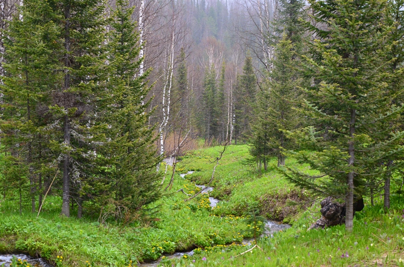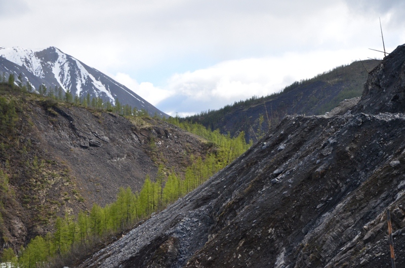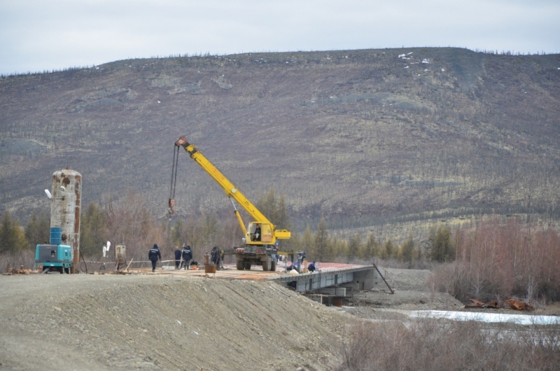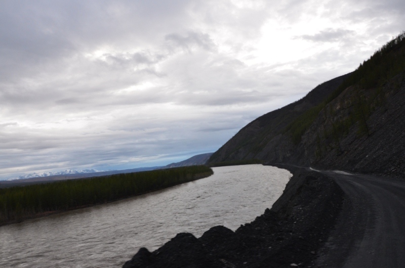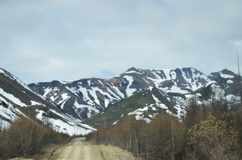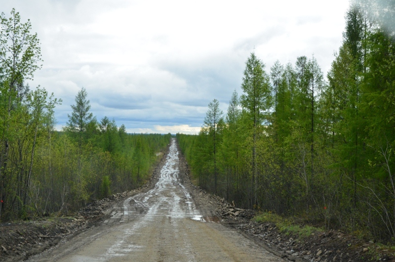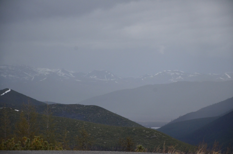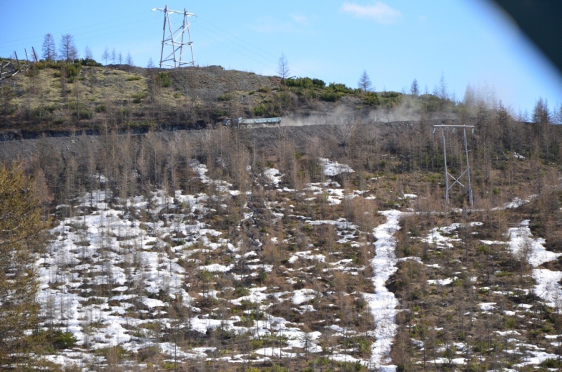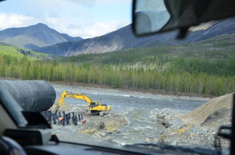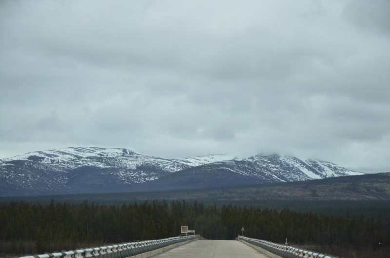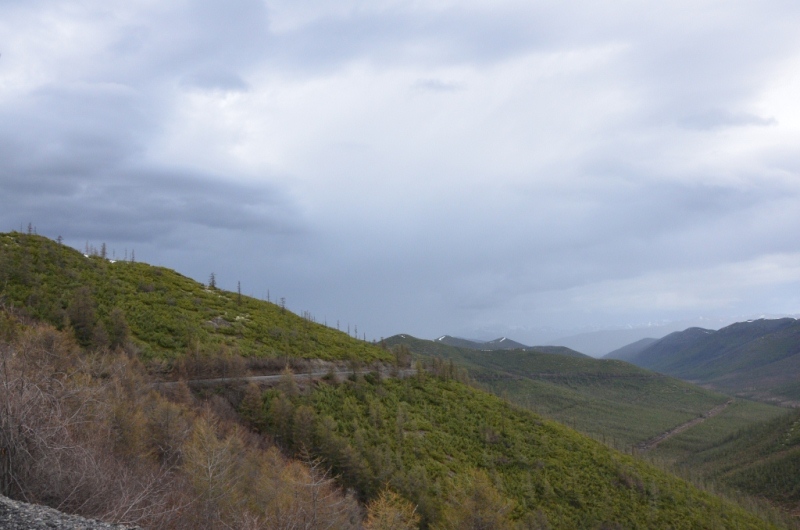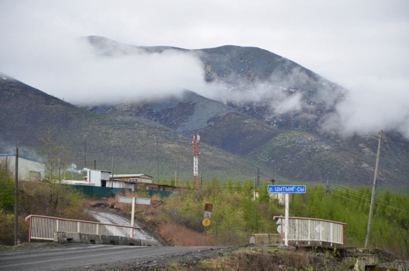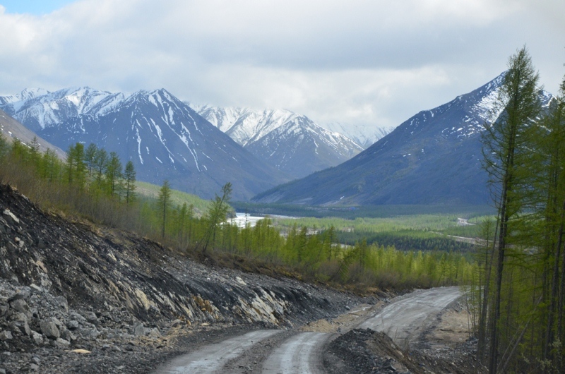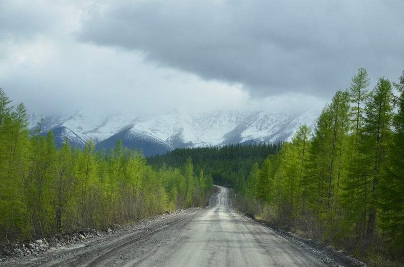 Ночевали около шиномонтажки напротив АЗС в машине, даже спальник от стоявших на нем коробок освобождать не стали. Хозяин на телефон не отвечал, хотя номер был записан крупными буквами на здании (да и местные жители сказали звонить ему в любое время). Наступило утро. Поменяли спущенное колесо на запаску. Объехали еще 2 места, но все было закрыто. Где-то около 11 утра на одной шиномонтажке, что находится ближе к выезду из поселка, за 150 рублей купил пинцет и заделал шнурком пробой на спущенном колесе, висевшем уже на запаске. Сразу двинули в путь дальше. Индигирка была мутной и полной воды (буквально через 2 дня в новостях по радио услышали, что река топит прилежащие к ней районы). Туман поднимался по сопкам. Ольчанский перевал заворожил меня уже второй раз, на нем сделали не-сколько фотографий. На перевале обнаружил, что подклинивает левый хаб-автомат. Мозги крутить он начал еще в Магадане, когда в положении «Авто» был включен. Тогда не придал этому особого внимания, т.к. откатился назад, и он отключился. Кроме того начал сопливить левый кулак. Еще при переборке моста и замены пар с установкой блокировки в конце лета 2013 года новый сальник несколько пропускал масло, однако на тот момент в запасе сальника не было. Критичного ничего не обнаружил, двинулись дальше. Р. Эльга была также полна воды. Дорога пошла на троечку-четверочку. Попадались разбитые дождем ямы, крупные торчащие камни. Но скорость держалась 70-100 км/ч. На сопках начал по-являться снег. На свороте на старую Колыму в районе Кюбюме заправились на АЗС. Многие критикуют данную заправку, но рискнул второй раз, как и 4 года назад. Цена на топливо ниже магаданской (одинакова с Теплым Ключом) – чуть более 37 рублей за литр. Топливо оказалось на хорошем уровне. Через р. Кюбеме ведется строительство моста в завершающей стадии. Вдали виднелись сопки Верхоянского хребта, все в снегу. Весна еще только зарождалась в этом районе. Дорога стала превращаться в горную, одноколейную. Прошли «Заячью петлю». Сразу начался свой микроклимат – снова зеленые лиственницы, солнце. Появились дорожники, ведущие активно работы на «Черном прижиме». Объем работ впечатляет. Строится новый мост, расширяется дорога, снизу бурлящая р. Восточная Хандыга. Конечно, по сравнению с четырехлетней давностью не такой уже здесь колорит, но все ж «Черный прижим» остается одним из красивых мест «Колымы». Далее последует череда фотографий данного участка дороги. На «Желтом прижиме» работы меньше, да и порода сама по себе более мягкая. Расширили его основательно. За «Желтым прижимом» меняли трубу на дороге, экскаватор сломался, а ПРМ не могли вызвать. В результате возникла пробка с обеих сторон. Постояли минут пять, и я пошел посмотреть объезд. На расспросы дорожником придется ждать часа полтора-два, объезда нет. Выше была тракторная дорога и сделана дам-бочка через ручей. Минуя стоявший УАЗик, пошли через эту дорогу, спустились к ручью. Ручей перешли свободно, на блокировках перелезли через дамбу и потом выехали на дорогу под удивленные взгляды окружающих. До Теплого Ключа доехали к 19 часам вечера. Дорога то хорошая, то отсыпанная подготовленная к ремонту не очень. Через р. Росомаха, на которой завис 4 года назад, построен добротный мост. Такие же мосты и через другие ручьи, которые зачастую обозначены просто километражом дороги «Кол