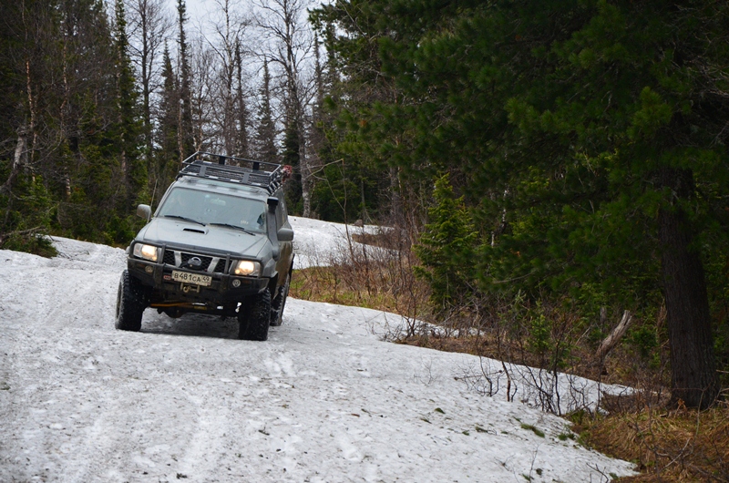 Утром поехали по магазинам искать втулки на амортизаторы. Объехали несколько магазинов, в т.ч. и официальных представительств, но только на заказ. На Красноярском рабочем в магазине Kayaba приобрели оригинал втулки на амортизаторы Land Cruiser. Съездили в Торговый центр, проехали по переулку Якорному, где прожил я 4 года во время учебы в КГАЦМиЗ. Заправлялись на выезде по Дивногорскому тракту. Решили идти по нему, а не через Зеледеево, т.к. здесь короче и быстрее. Выехали из Красноярска в 13 часов. На пути к Дивногорску закупили муксуна, чира (Енисейского), щуку и тайменя. На переезде через Енисей в районе Красноярской ГЭС сделали фотосессию. На перевале за Бирюсой было чуть более нуля, природа только начала про-сыпаться от зимнего сна. Проехали Балахтинский район, Новоселовский и въехали в Хакасию. На оз. Беле отдыхающих никого и немудрено, т.к. еще очень холодно. В Шира заправились и направились в сторону Коммунара. Проехали асфальт. По Ефремкинским срезкам стало жестко идти, поэтому остановились и спустили колеса до 2 атм. На горячую давление в колесах до этого было 2.5 атм. Затем 24 км быстро докатили до Коммунара к родителям. Общий пробег составил с места старта 7 056 км по спидометру. Здесь решил я пробыть 3 дня и стартовать дальше в Воронеж, но уже с родителями. В день приезда сразу же баня, отдых. Ниже представлен небольшой видеоролик данной части путешествия ссылка доступна только зарегистрированным Коммунар На следующий день ближе к обеду решили съездить за черемшой, а после этого сделать ТО машине. Черемшу обычно рвем на Кузнецовке либо Спасских гольцах. Ехать надо в сторону Базана до перевала, оттуда уходить направо на Кузнецовку. Собрались в паре с квадроциклом. Решили параллельно производить съемку с квадрика. Дороги на Спасские гольцы не было – очень много снега. Выехали около 10:30. За штольней №18 переехали р. Собаку. Дорога в более-менее удовлетворительном состоянии (мне на 35 колесах так показалось). До перевала шли со скоростью 40-60 км/ч. Базановский перевал размесили и продавили Уралы, возившие топливо в артель. Заехали на него и свернули в сторону Кузнецовки. Здесь же я залочил хабы, т.к. начинался снег. До подъема был УАЗовский след, по которому легко пробрались. Дальше УАЗ не прошел, т.к. снег был до полутора метров, но спрессованный. Тут подошел еще один знакомый квадроцикл. Спустились до 0.5 атм, включили блокировки и пошли по барханам снега. Patrol шел довольно легко. Смущали только уклоны, по которым он елозил юзом. На спуске с перевала боковые уклоны снежных барханов стали критические, поэтому развернулись и поехали обратно. Решили заехать на Спасские гольцы не через Кузнецовку, а с обратной стороны Базановского перевала по ручью. На перевале обошли квадриков и пошли на спуск. В это время пошел дождь. После сворота на псевдодорогу для подъема к Спасским гольцам на блокировках не заскочили. Надутый до 2 атм. Гудрич КМ2 замыливался и не хотел ехать. Спустился до 0.5 атм. И свободно поехал. Поднялись до места, где уже появилась черемша и остановились. Дождик прекратился. Примерно час провели вверху. Наверху перед спуском накачались до 2 атм., что было сделано зря. Стояли, как корова на льду. На спуске АБС не помогала, колеса блокировались и машина просто летела вниз. В одном месте пошли прямо по болоту и провалились: протектор просто забился, но с бл