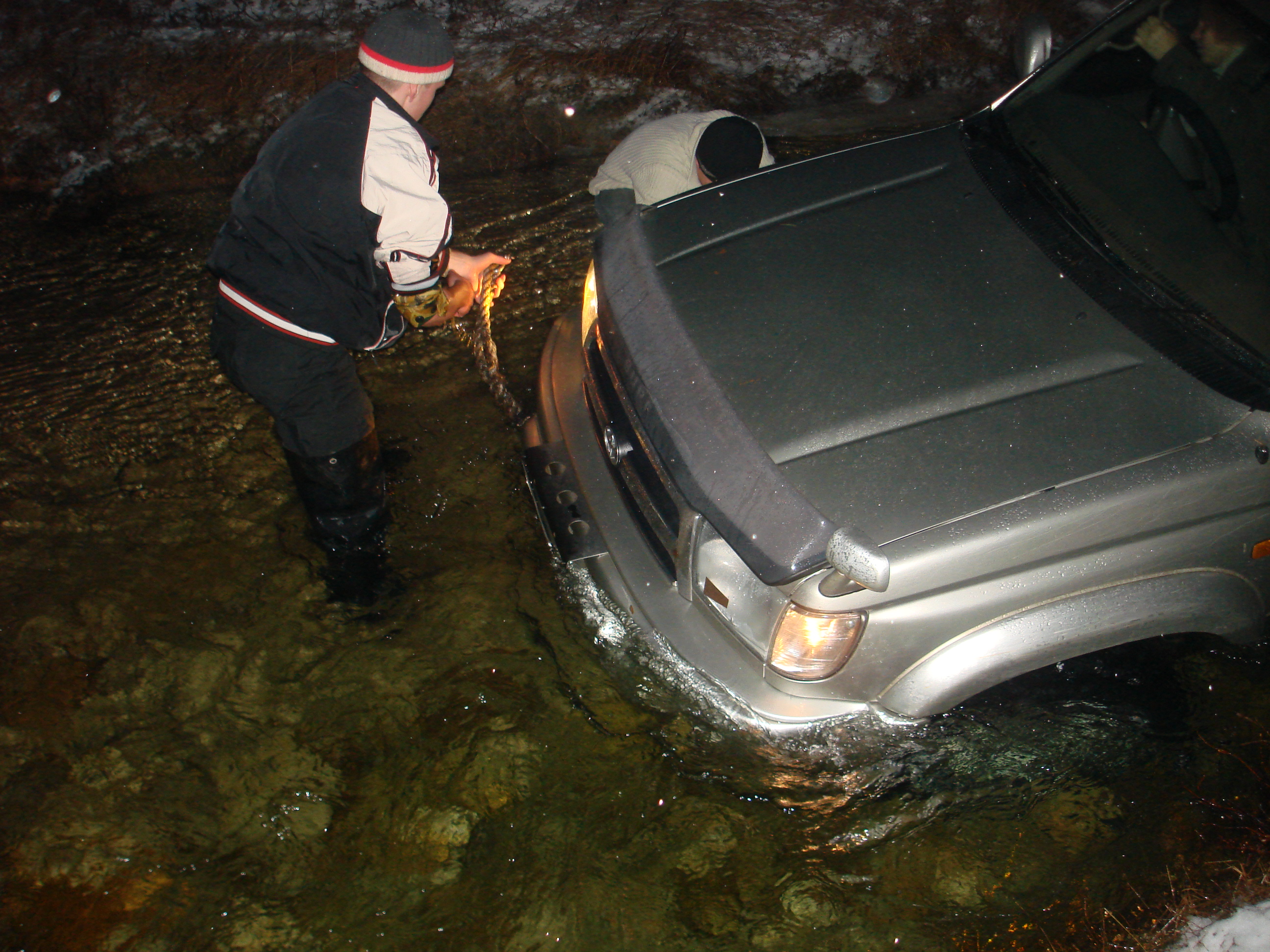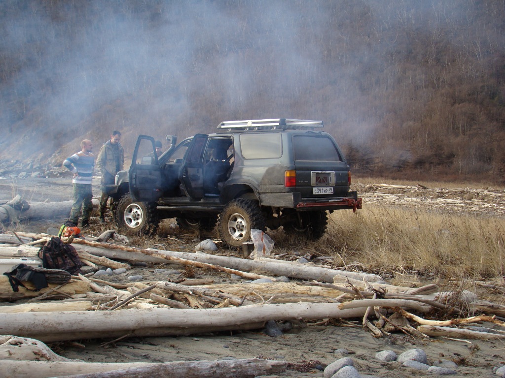 Началось со сбора на Колибри. Точнее не так. Я продрал глаза и долго тупил, глядя на падающий с неба снег. Ну фигли делать, уже договорились. Заехал за Маленьким Апельсином, поехал на встречу. Там приняли окончательное решение, несмотря на погоду, ехать на Оксу. Там же созвонились с Андреем и Таней и договорились, что они нас догонят. Спускаться на Речную от Колибри побоялись - гололед редкостный! Даже на спуске у ДК пришлось попотеть, ловя машину на льду. Перевал переехали быстро. Снег шел. И шел он в течении всего дня с переменным успехом Свернули на Оксу. Дорога миллиона камней. Реально не считал, но минимум миллион точно. Дорога представляет из себя перебежки от бродов петляющей речки. Река очень мелкая оказалась. Обнарушили следы ~36 Симекса и ~35 Бакшута. Каждый брод давался нелегко. Нас несколько задерживал экипаж Эйвона, но это вызывало у нас отнюдь не злобу и раздражение, а скорее удивление и восхищение такой целеустремленности. На стандартном авто, на маленьких колесах, продираясь между булыжников.... они буквально на бумаге расчитывали траекторию со всеми векторами сил и чуть ли не с рулеткой замеряли камни. Но дорога оказалась сильнее. Было принято решение бросить их машину. Нас как раз донали Андрей с Таней. Быстренько долетели до устья. Просто потрясающее место. Словами не передать красоту волн, бьющихся о пляж. На этом пляже выполнил свою мечту дурака - пронестись на бешеной скорости по прибою. Активно покрутили круги по песку. Поели. Раньше всех с нами попрощались Андрей и Таня. Пожелали им счастливого пути и ... тоже вскоре стали собираться. Забрали Эскудика Эйвона. Обнаружили у него потекший бак... и ... опять дорога миллиона камней. Камни стукались в рычаги, броню, траверсу, пороги. Камни самой разной формы. Все камни большие. Хрен с места сдвинешь и хрен объедешь. В общем, любители триала - это ваша дорога! Уже буквально в километре от моста Кузя застрял в русле реки, опустив левую часть своего авто по бампер. Мой штурман и Ворон долго потом ещё отходили от погружения рук в ледяную воду, чтобы зацепить трос, который, зараза, не хотел лезть на своё место. Вызволили. Вылили воду из салона. А потом Сурф заглох. Выволокли на берег. Беглый осмотр показал рабочую искру.... в принципе это была последняя хорошая находка. Ну не считая того, что вода в горшки все-таки не попала. Некоторая часть воды все же смогла попасть в масло. Танцы с бубном привели нас к выводу о выходе из строя бензонасоса. Уже вовсю ходили разговоры о необходимости зацепить Сурфа на шнурок и выволочь, не теряя времени, но мы не теряли надежды, роясь в недрах топливной системы автомобиля. В итоге дымок из под торпеды перевесил чашу спора на стороу эвакуации. Проводку отрубили, привязали самый могучий автомобиль - Женин Сафари к Сурфу и доволокли уже по темноте его до моста. операция по вытаскиванию сурфа на дорогу по склону, по которому даже на рабочей машине ехать страшно, особенно в такую погоду, заняло у нас ещё полчаса и некоторой сноровки. Были применены методы: с избы по нитке (точнее с авто по тросу), "тросогаситель", испытали свои силы в русской народной забаве "Перетягивание каната" и даже немного успели поиграть в паровозики!!! я был локомотивом Дальнейшая операция заключалась в том, что нас послали.... вызывать эвакуатор, для этого пришлось подняться на вершину перевала и 