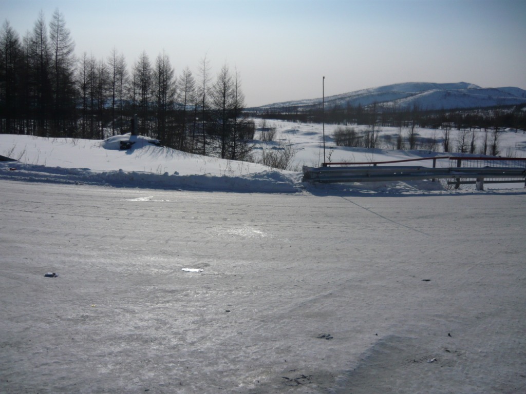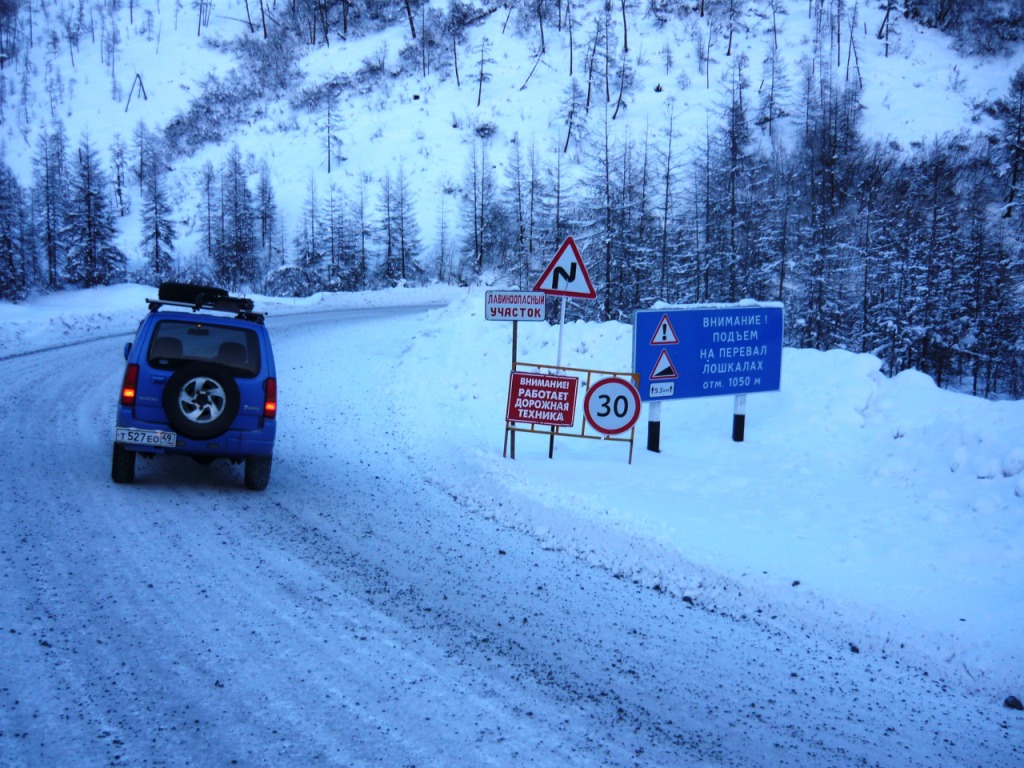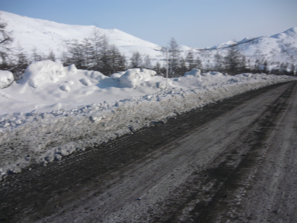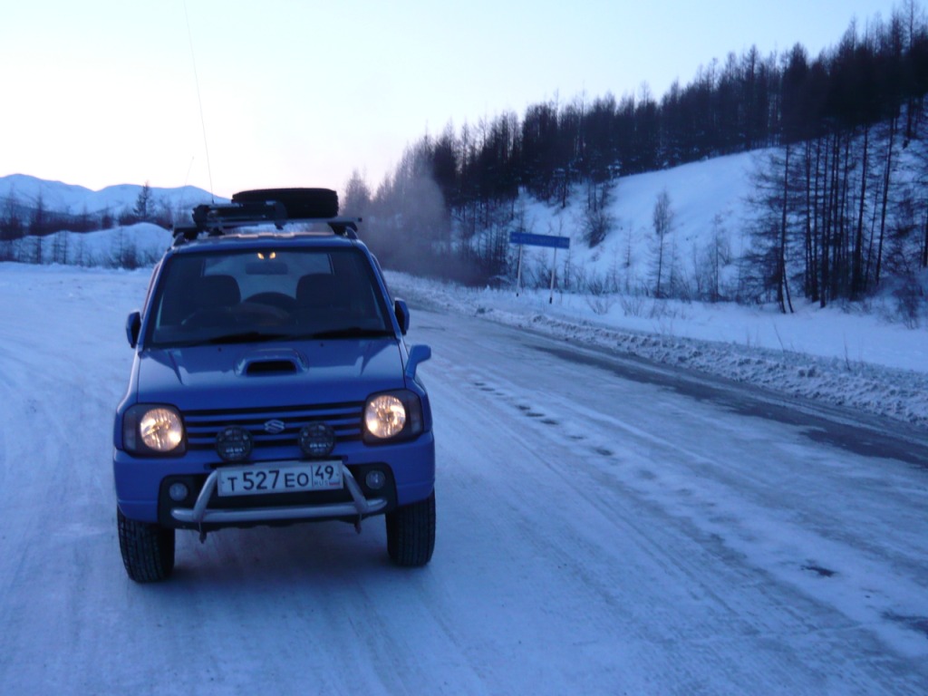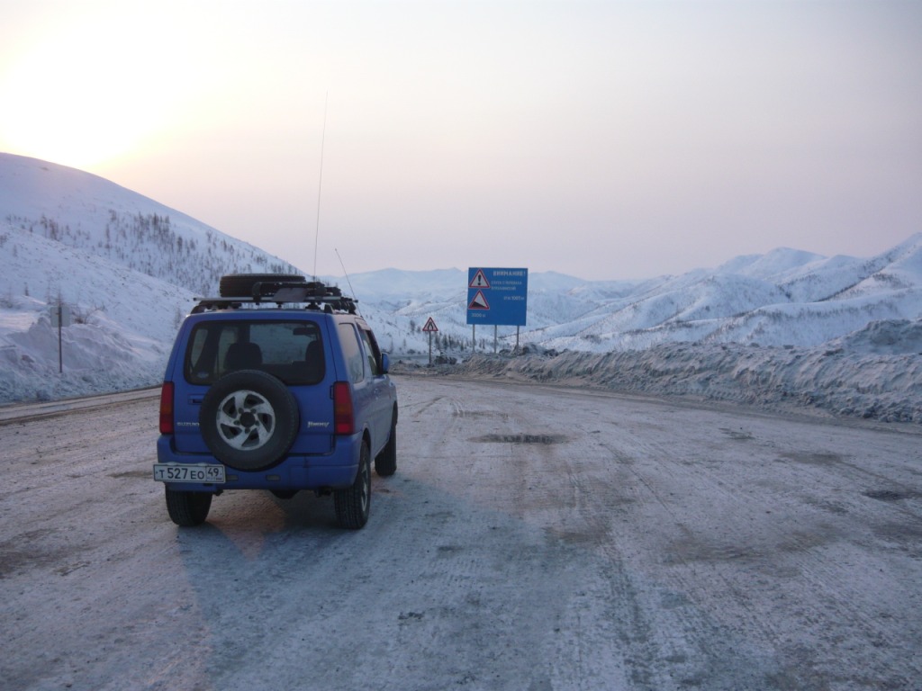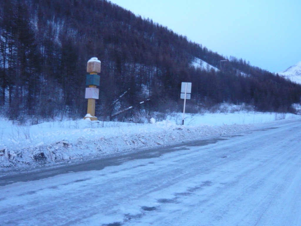 Целью поездки являлся осмотр участка дороги Усть-Омчуг - Нулевой километр в дневное время ранней весной. Планировался выезд в 6 утра, ночёвка в посёлке Холодный и возвращение в Магадан по основной трассе. Темп предполагался спокойный, с остановками и фотографированием. Машина Сузуки-Джимни, 0,7 литра, 2004 год. Задние сидения сняты и там лежит весь шмурдяк. В связи с тем, что в выходные дни трафик по Тенькинской трассе очень мал и не исключалась ночёвка в машине, был сделан акцент на тёплой одежде, спальном мешке и запасе еды на сутки. Для того, чтобы укрыть капот на ночь в случае ночёвки на дороге, были взяты несколько больших кусков брезента и покрывало. Машина в моих руках четыре года и с такими поездками смирилась. В пути ничего не разу не ломалось, кроме давнего прокола колеса в Дебине. Тем не менее, всегда вожу ключи, ремень и катушку зажигания. Кроме того, на крыше шестое колесо, лопата и довольно длинная верёвка. Дополнительно установлены дуга, на неё ещё одни фары и рация (хорошо помогает в мякитской пыли летом). Всегда беру с собой горячую воду в канистре, т.к. часов через 5 хочется хорошо умыться. Как правило, с собой две канистры бензина (около 38 литров). Второе лобовое стекло в этот раз не устанавливал, т.к. днём тепло и еду я один. В машине не жарко и не холодно - на мне две рубашки, тонкий свитер, горнолыжные штаны. Зимние сапоги на размер больше. Имеется привычка сидеть за рулём только в носках. Печка работает в среднем режиме, чтобы не осушать воздух и не часто пить. Компоновка машины не располагает к высокой скорости или я не гонщик, насмотревшись на трассовские аварии езжу не быстро, а по Теньке - особенно. Итак, 8 марта в 6 утра, я отправился в путь. В цветочном магазине были куплены и упакованы тюльпаны и машина неспешно покатила в неблизкую дорогу. Первая остановка - заправка на Соколе. Температура -32, свежо. Залился полный бак и вперёд. Приятно ехать утром и испытывать "щемящее чувство дороги"... Следующая остановка - магазин на Палатке, в котором есть пекарня и свежая выпечка. Я сильно сомневался, что 8 марта рано утром будут свежие балабасы и оказался прав - магазин работал, но вкусняки были вчерашние. Пополнив запасы, я двинулся дальше. Миновав таможню, сворачиваем на Тенькинскую трассу. Заброшенные дома наводят на грустные мысли - главным образом о диссонансе между тем, что говорят с экрана "говорящие головы" и тем, что вокруг... Участок дороги до Нелканди я считаю достаточно опасным, уже привык, что кто-то валяется в кювете, но на этот раз никто не улетел - я сильно удивился. Очень жалею, что не видел старого моста через Нелкандю, только на фотографиях. Рассвело, появилось солнце, езда доставляет удовольствие... Перевал Гусакова. Я попрыгал-побегал, сфотографировал стеллу "Тенькинский район" и - врерёд. На вершине перевала установлены щиты снегозадержания, перемёта и козырька нет, да и снега немного - бывало и больше. Дорога в хорошем состоянии, располагает к быстрой езде. 70 километр, руины посёлка "Госрезерв". Я не знаю его точного названия. Относительно недавно гулял среди брошенных домиков, теперь осталась только стена от гаража из бутового камня. Огромный ангар, с крыши которого фотались окресности, исчез. Всё проглотило всеядное время. Мадаун. Проезжаю через посёлок, по старой дороге. Мадаун очень нравится, самый старый посёлок на Теньке и
