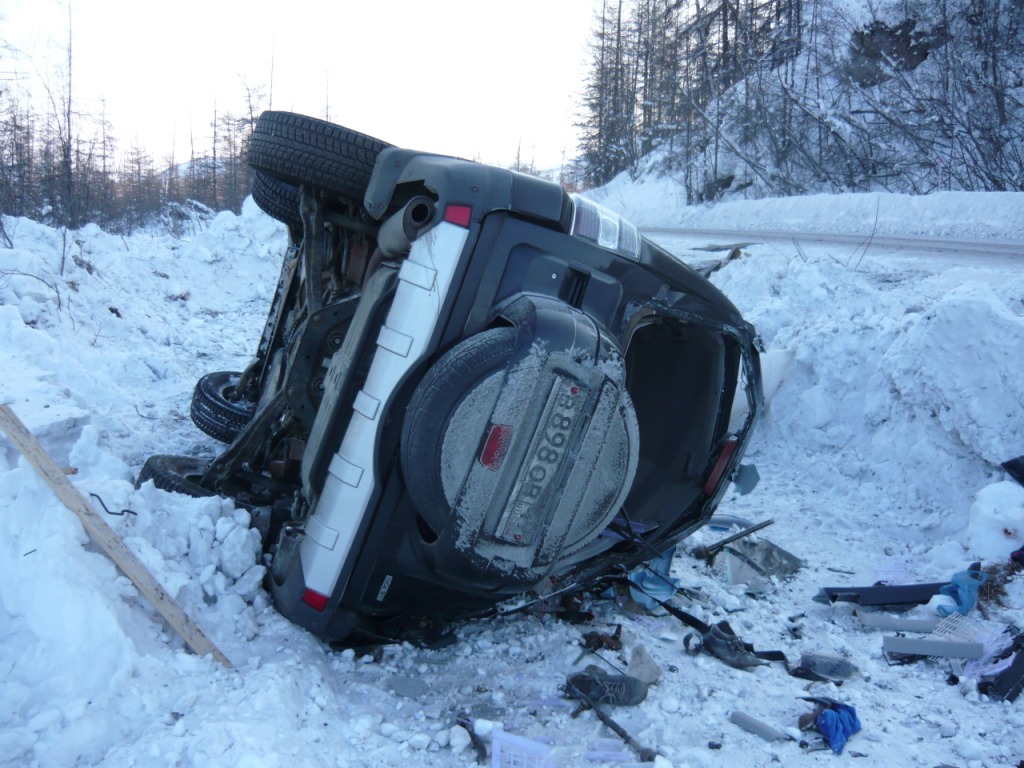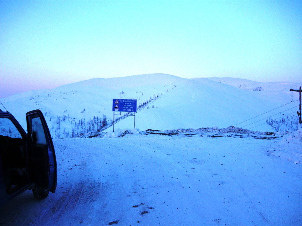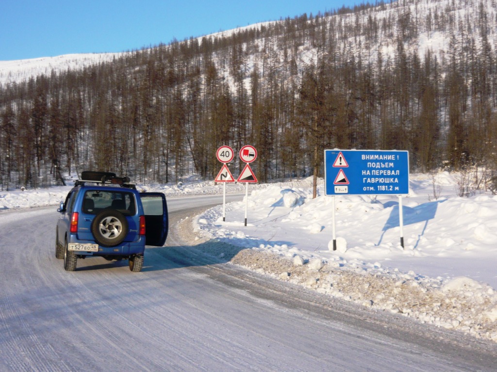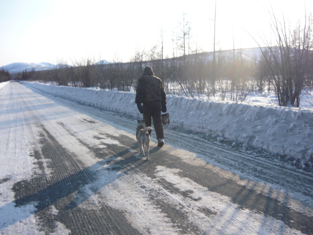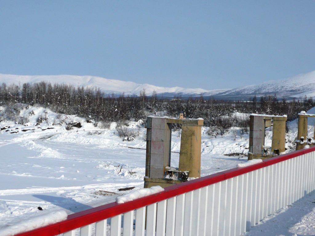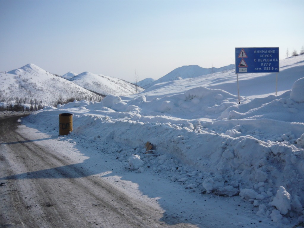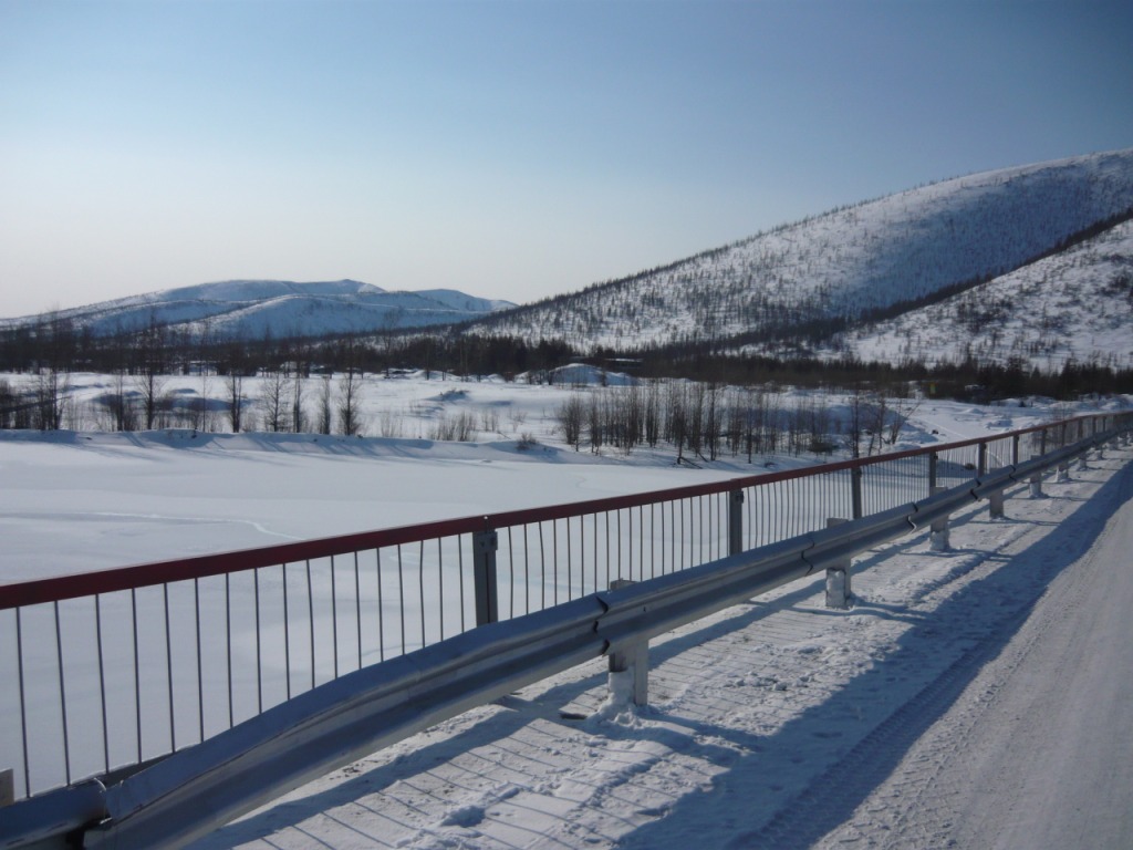 Целью поездки являлся осмотр участка дороги Усть-Омчуг - Нулевой километр в дневное время ранней весной. Планировался выезд в 6 утра, ночёвка в посёлке Холодный и возвращение в Магадан по основной трассе. Темп предполагался спокойный, с остановками и фотографированием. Машина Сузуки-Джимни, 0,7 литра, 2004 год. Задние сидения сняты и там лежит весь шмурдяк. В связи с тем, что в выходные дни трафик по Тенькинской трассе очень мал и не исключалась ночёвка в машине, был сделан акцент на тёплой одежде, спальном мешке и запасе еды на сутки. Для того, чтобы укрыть капот на ночь в случае ночёвки на дороге, были взяты несколько больших кусков брезента и покрывало. Машина в моих руках четыре года и с такими поездками смирилась. В пути ничего не разу не ломалось, кроме давнего прокола колеса в Дебине. Тем не менее, всегда вожу ключи, ремень и катушку зажигания. Кроме того, на крыше шестое колесо, лопата и довольно длинная верёвка. Дополнительно установлены дуга, на неё ещё одни фары и рация (хорошо помогает в мякитской пыли летом). Всегда беру с собой горячую воду в канистре, т.к. часов через 5 хочется хорошо умыться. Как правило, с собой две канистры бензина (около 38 литров). Второе лобовое стекло в этот раз не устанавливал, т.к. днём тепло и еду я один. В машине не жарко и не холодно - на мне две рубашки, тонкий свитер, горнолыжные штаны. Зимние сапоги на размер больше. Имеется привычка сидеть за рулём только в носках. Печка работает в среднем режиме, чтобы не осушать воздух и не часто пить. Компоновка машины не располагает к высокой скорости или я не гонщик, насмотревшись на трассовские аварии езжу не быстро, а по Теньке - особенно. Итак, 8 марта в 6 утра, я отправился в путь. В цветочном магазине были куплены и упакованы тюльпаны и машина неспешно покатила в неблизкую дорогу. Первая остановка - заправка на Соколе. Температура -32, свежо. Залился полный бак и вперёд. Приятно ехать утром и испытывать "щемящее чувство дороги"... Следующая остановка - магазин на Палатке, в котором есть пекарня и свежая выпечка. Я сильно сомневался, что 8 марта рано утром будут свежие балабасы и оказался прав - магазин работал, но вкусняки были вчерашние. Пополнив запасы, я двинулся дальше. Миновав таможню, сворачиваем на Тенькинскую трассу. Заброшенные дома наводят на грустные мысли - главным образом о диссонансе между тем, что говорят с экрана "говорящие головы" и тем, что вокруг... Участок дороги до Нелканди я считаю достаточно опасным, уже привык, что кто-то валяется в кювете, но на этот раз никто не улетел - я сильно удивился. Очень жалею, что не видел старого моста через Нелкандю, только на фотографиях. Рассвело, появилось солнце, езда доставляет удовольствие... Перевал Гусакова. Я попрыгал-побегал, сфотографировал стеллу "Тенькинский район" и - врерёд. На вершине перевала установлены щиты снегозадержания, перемёта и козырька нет, да и снега немного - бывало и больше. Дорога в хорошем состоянии, располагает к быстрой езде. 70 километр, руины посёлка "Госрезерв". Я не знаю его точного названия. Относительно недавно гулял среди брошенных домиков, теперь осталась только стена от гаража из бутового камня. Огромный ангар, с крыши которого фотались окресности, исчез. Всё проглотило всеядное время. Мадаун. Проезжаю через посёлок, по старой дороге. Мадаун очень нравится, самый старый посёлок на Теньке и