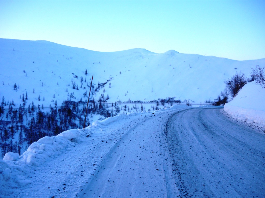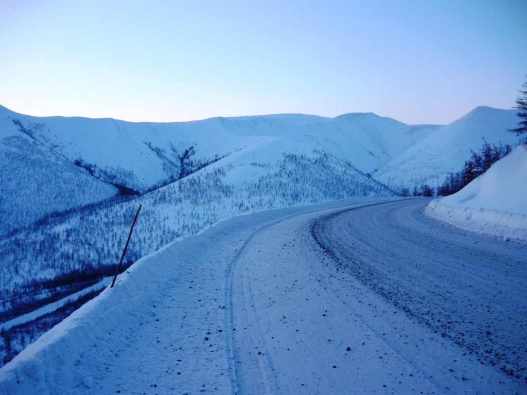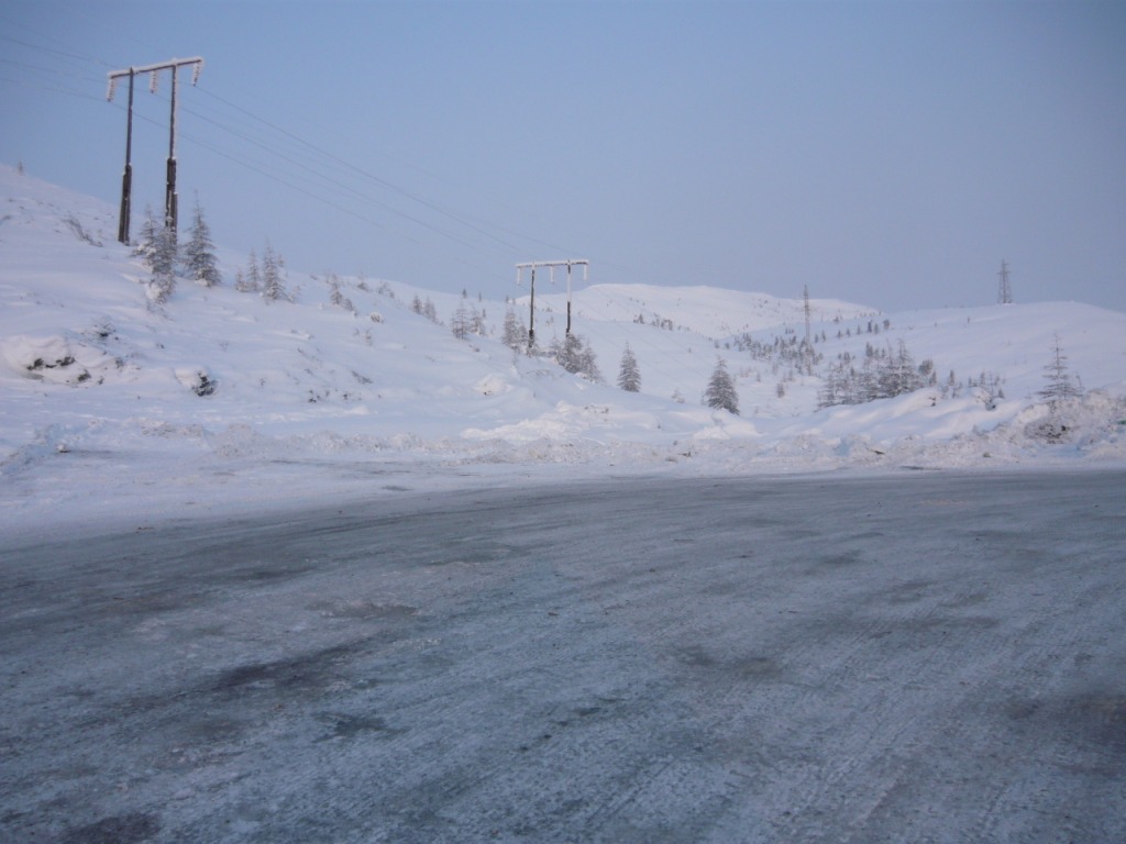 Окончание будет значительно короче, чем первая часть повествования. Спалось на новом месте не очень, было душно, кто-то катался ночью по посёлку на буране… В голове крутились мысли о чужих сложностях и проблемах. О машине не волновался – то ли из-за того, что не замерзал ни разу, или по другой причине… Самое плохое для машины, не мороз, а ветер, но ночью было тихо и температура двигателя по сигнализации не падала ниже нуля. Сложности начались потом. Я рассчитывал выехать рано утром и приехать в город к 8 вечера, но бодрый утренний мороз -45 внёс существенные коррективы. Сначала подвела дверь – замёрз замок и она не захлопывалась, потом выяснилось, чтобы повернуть руль, надо приложить значительное усилие. Кроме того, я выключил на ночь печку в салоне, чтобы меньше выхолаживать двигатель и это тоже не добавило радости – руки мёрзли от руля... Проверив селектор АКПП и включив пониженную скорость я потихоньку выехал из сугроба и решил сделать небольшой круг по посёлку. И вот только тронувшись, я осознал, как замёрзли колёса и как трудно будет ехать. Решил – надо дать машине постоять минут 30, пусть хоть салон прогреется, а я пока соберу барахло и попью чаю ещё раз. Сказано – сделано… Перекусив и побросав в собачник шмурдяк, я решил тронуться в путь. К этому времени немного прояснилось, сильного тумана не было и я решил, что потихоньку надо двигаться – стоять нельзя – завтра на работу. Хорошо, что у меня хватило ума не трогать другие двери – ни одна бы не захлопнулась и они бы все гремели, а так не захлопнулась только водительская и я её просто придерживал. Сидеть теперь пришлось в куртке и шапке, на руках – перчатки. Первый километр пути показался сущим адом – машина прыгает на квадратных колёсах, сама дорога совсем не ровная и очень трудно крутить руль – перед поворотами приходилось притормаживать, чтобы успеть повернуть. Я всерьёз боялся, как бы не рассыпались колёса, но после пары километров эта мысль пропала. Двигатель работает устойчиво, коробка переключается нормально, постепенно всё нагревается, и на трассе нет машин – я, со своими 40 километрами в час, никому не мешаю. Беспокоит только не захлопывающаяся дверь. От Холодного до Сусумана 17 километров и ни одной машины, только какой-то Терраник стоял на обочине в Дражном. Я рассчитывал заправить в Сусумане 20 литров, а потом спокойно ехать на своём бензине. Если бы заправка не работала, пришлось бы заливать канистру. На морозе это удовольствие - ниже среднего. Но всё обошлось, самое сложное оказалось – свернуть на заправку и подъехать к колонке. Это получилось только со второй попытки. Заправщица долго не отзывалась, потом просила у меня сигарет и только потом запустила свою адскую колонку. Залив 20 литров, я продолжил путешествие. В это раннее, морозное утро Сусуман выглядел мрачно. Над посёлком висела сизая дымка от котельной, на улице никого, только у магазина стояла вахтовка и там я увидел людей. Останавливаться и что-либо фотографировать не было никакого желания и я прибавил газу. К этому времени показалось солнце, колёса размягчились, машина побежала резвей, дорога стала лучше и настроение поднялось. Самое главное – переехать Бурхалинский перевал – после него должно немного потеплеть, солнце поднимется и будет светить прямо в лоб – станет совсем тепло. Слушая музыку и мечтая о лете, 