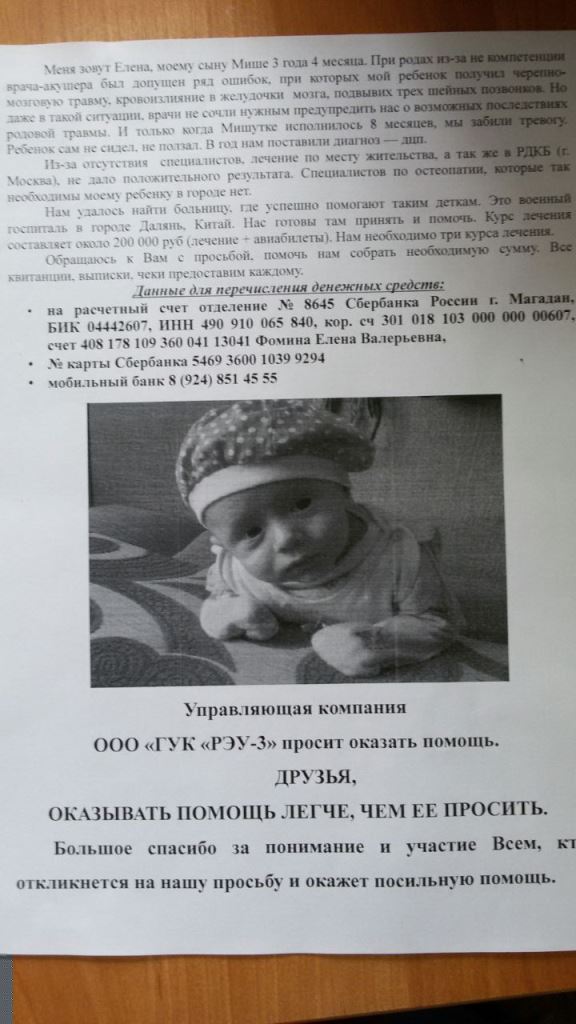 Уважаемые форумчане, Мише три с половиной года, у него ДЦП - последствие родовой травмы, диагноз был поставлен в возрасте 8 месяцев, он проходил лечение в Магадане и Москве, но безрезультатно. Шанс помочь ребенку есть - необходимо лечение в Китае, денег на него у родителей Миши нет, все возможные варианты они уже исчерпали. Всего необходимо около 600 000, часть суммы уже собрана, сбором средств занимается также ГУК "РЭУ-3", где работает мама Миши, Елена Фомина. С родителями Миши я связывалась, они будут рады любой помощи. Ниже размещаю выписку из истории болезни.
