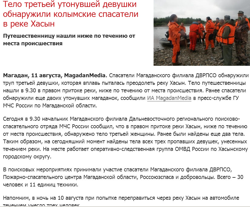 Шестерых человек, которые накануне смогли выбраться из машины и самостоятельно перебраться на другой берег реки Хасын, обнаружили региональные спасатели. По-прежнему остается неизвестной судьба двух девушек, которых, по всей вероятности, унесло течением. Тело еще одной магаданки отыскали накануне, женщина оказалась мертва, сообщает ссылка доступна только зарегистрированным "" ....девять человек в Эскудике.... -------------------- Без запретов и следов,