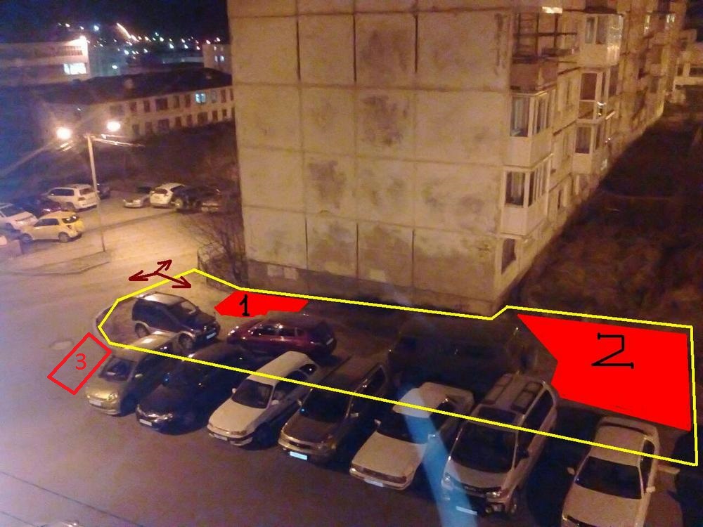 Я тогда написал жалобу и даже мэр города приезжал с журналистами. Поругался на то что получилось, пообещал скорый ответ с мерами, но как водится на этом дело и померло. Уже после я узнал от компетентного человека что по нашим законам иначе нельзя, ибо законы писаны во времена двух запорожцев и трех жигулей на весь квартал. Получившейся гигантской площадкой пользуются псиноводы и педофилы (в этих кустах пару лет назад извращенец чуть не убил ребенка). Она пришла в запустение сейчас являет собой заросший пустырь. Но это все призказка. Сказка далее. Выделенный желтым контуром участок используется под парковку. Въезд только со стороны стрелки, других выездов нет. И я хочу попросить каждого, кому не лень, написать в ответном посте в какую зону желтого участка он припаркуется на ночь, при расстановке авто как на фото. В место 1 или где-нить в месте 2? И почему? Заранее огромное спасибо за участие. -------------------- |
