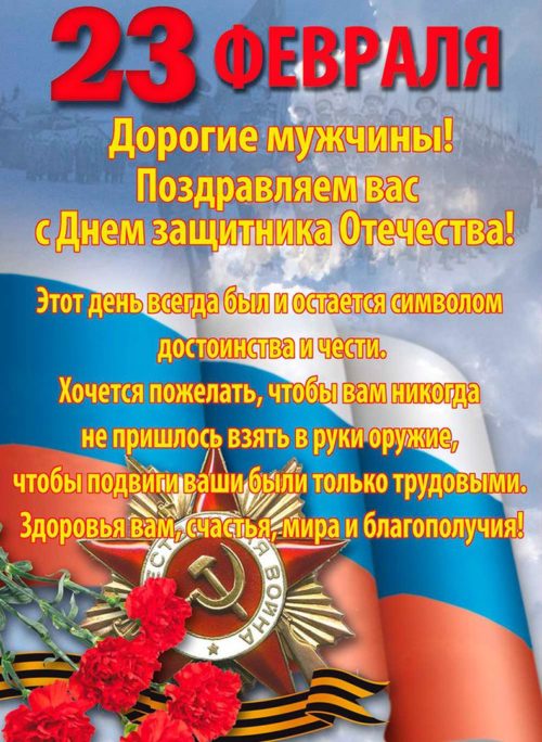 С праздником вас дорогие мужчины! В этот истинно мужской день хочется вам пожелать много энергии и сил для достижения своих целей, мудрости и терпения, как в работе, так и в личной жизни. Пусть ничто не угрожает вашей семье и приклады ружей не касаются ваших рук. Пусть танки появляются только на параде, а самолеты летают только мирные, пусть залпы пушек будут слышны в честь праздников и пусть матеря плачут только от радости. Живите с верой в будущее и не жалейте о прошедшем.