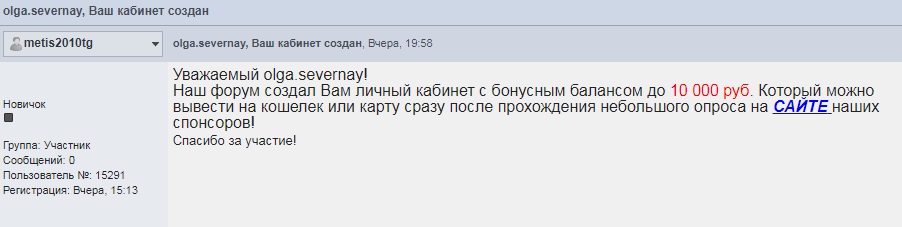 Цитата Уважаемый grandma! Наш форум создал Вам личный кабинет с бонусным балансом до 10 000 руб. Который можно вывести на кошелек или карту сразу после прохождения небольшого опроса на ссылка доступна только зарегистрированным наших спонсоров! Спасибо за участие! |