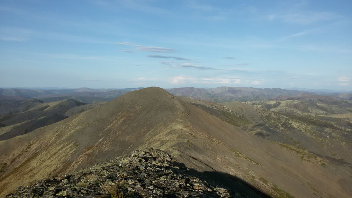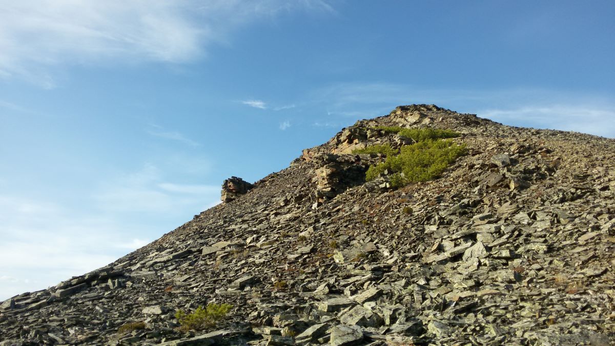 В общем, для тех, кто неравнодушен к горам, этот маршрут особого труда не составит. Я поднялся за час. Люди нечасто посещают эту гору - оно и понятно, далеко от города, да и среди стланиковых зарослей видны следы присутствия медведя. Ну а где на трассе их нет? Склоны горы из мелкого скальника, похожего на битую черепицу, почти не осыпаются и относительно пологие. В нижнем ярусе видел несколько характерных вмятин от лап и ниже их одну здоровенную, продолговатую - кто-то проехался на жопе. И это был не человек. На геодезическом знаке, если присмотреться, видно, что в нулевых были посетители из Ягодного. Интересно, когда-нибудь мы избавимся от привычки "Здесь был..."? Так что для любителей гор обозначу этот маршрут-поездку выходного дня. |