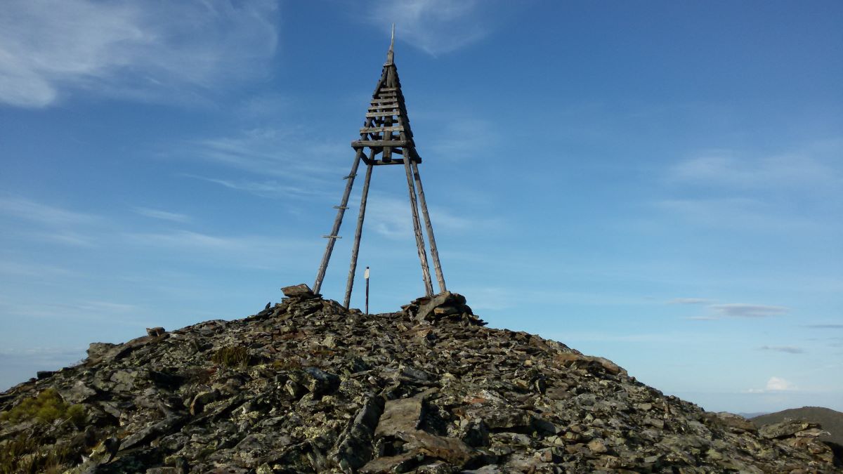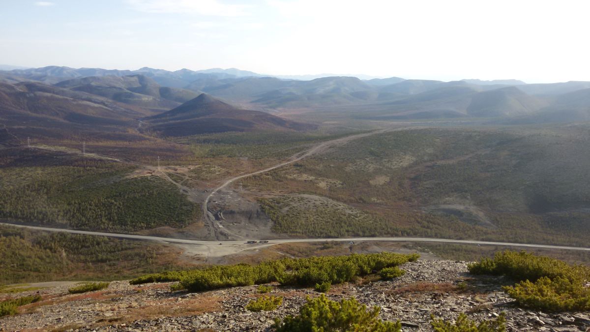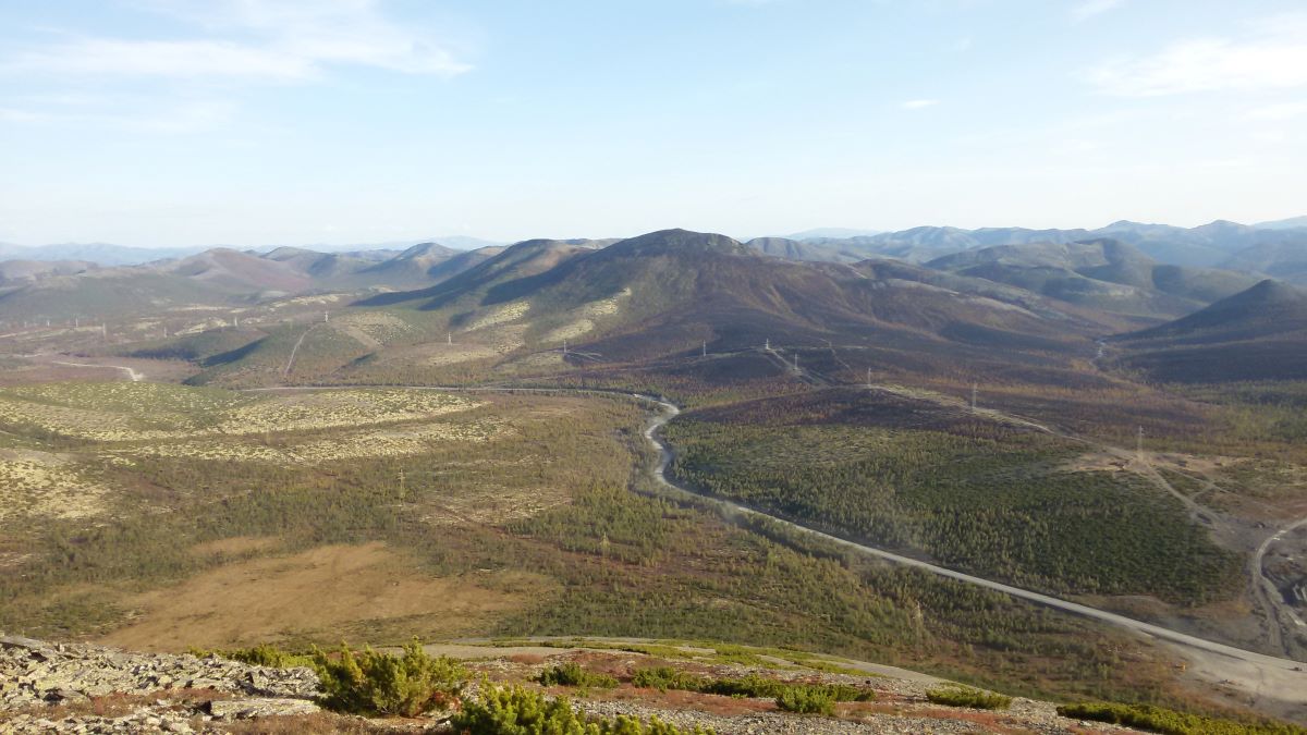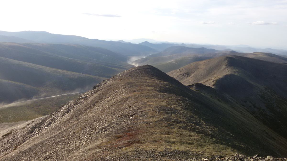 Почему именно так геологи назвали её на карте, неизвестно. Гора красивая, седловидная, и видно её на подъезде к гербинскому неплохо. Сколько раз проезжал мимо в течение многих лет, и в последнее время всё чаще посещала мысль о восхождении на эту гору. Благо, она не требует длительного подхода. Вершина перевала - и пожалуйста, поднимайся. Тем более, что погода была на редкость хорошая - тепло и солнечно. Но там, где площадка для дальнобоев, подъем будет затруднен из-за стланика. А стланиковые заросли - это зло. Это мы проходили. Поэтому чуть ниже есть ещё лэповская площадка, откуда более удобно начать. Неприятно только проходить под "зудящими" проводами ЛЭП - кажется. что вольтова дуга испепелит тебя...