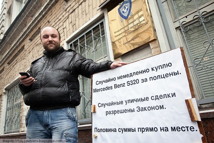 04 февраля 2013 Сегодня днем около Координационного Совета Генеральных Прокуроров государств-участников СНГ координатор "Синих ведерок" Петр petunder Шкуматов провел одиночный пикет, посвященный недавнему ДТП со смертельным исходом. Напомню, авария произошла 6 октября на улице Хачатуряна в Москве. Камера видеорегистратора автомобиля, ехавшего в потоке машин, засняла момент наезда на 26-летнюю Александру Зимину. Сотрудник Совета генпрокуроров СНГ, скрывшийся после наезда на девушку в Москве, заявил, что продал машину за несколько минут до аварии. По словам Замира Абдулкеримова, это была случайная "уличная" сделка. В тот день сотрудник прокуратуры остановил свой Mercedes S320 возле киоска и вышел, чтобы купить пачку сигарет. В этот момент к нему подошел мужчина и сказал, что ему понравилась машина и он хочет купить ее немедленно. Абдулкеримов получил половину суммы прямо на месте и передал покупателю ключи от автомобиля. -------------------- Fortuna Favet Fortibus