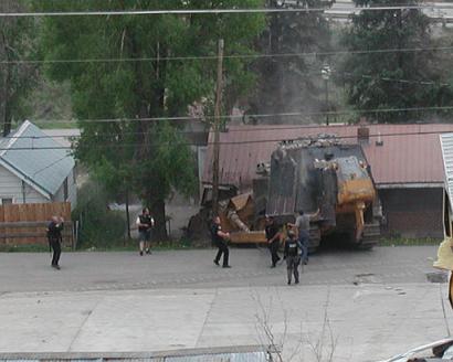 Цитата из педивикии: Цитата Marvin Heemeyer (28 октября 1951 – 4 июня 2004) — американский сварщик, владелец мастерской по ремонту глушителей в Грэнби(англ.), штат Колорадо фото. (2200 жителей) . Свой земельный участок под мастерскую и магазин он официально выкупил на аукционе, заплатив порядка $15 000, для чего продал свою долю в большом автосервисе в Денвере. В качестве хобби, строил снегоходы и зимой катал на них по окрестностям Гранби молодоженов. У него даже была соответствующая лицензия. Служил в свое время в ВВС США аэродромным техником, после занимался инженерно-технической деятельностью. Умер в пятьдесят два года, не женат. Пятидесятидвухлетний сварщик Химейер успел прожить в Гранби несколько лет, занимаясь починкой автомобильных глушителей. Его мастерская тесно примыкала к цементному заводу Mountain Park. К недовольству Химейера и других соседей завода, в 2003 году Mountain Park решил расширяться, вынуждая их продавать свои земельные участки. Химейер отказывал Mountain Park в приобретении своей земли. Поскольку все земли вокруг мастерской уже принадлежали заводу, ему перекрыли все коммуникации и подъезд к дому. Марвин решил проложить другую дорогу, и купил для этого списанный бульдозер "Komatsu D355A-3" восстановив на нем двигатель в своей мастерской. Городская администрация отказала в разрешении на прокладку новой дороги. После этого Химейер подал в суд на Mountain Park, но процесс проиграл. С тех пор как завод выкупил всю прилегающую к мастерской территорию, в мастерской начались частые проверки: налоговая по налогам с розничной торговли, пожарная инспекция, санэпиднадзор, последний выписал штраф на $ 2500 за «резервуар, не отвечающий санитарным нормам» в мастерской. Подключиться к канализации Марвин не мог, поскольку земля, по которой следовало прокопать канаву, тоже принадлежала заводу. Марвин заплатил штраф, приложив к квитанции при отправке записку — «Трусы». Через некоторое время у него умер отец (31 марта 2004), Марвин поехал на его похороны. Пока он был в отъезде, ему отключили свет, воду и опечатали мастерскую. После этого он закрылся в мастерской на несколько месяцев. 4 июня 2004 года, в 14:30 Химейер выехал из своей мастерской на бульдозере, обшитом стальной броней. На создание Бронированного бульдозера ушло около двух месяцев, по одним сообщениям, и около полутора лет, по другим. Химейер обшил его двенадцатимиллиметровыми стальными листами, проложенными сантиметровым слоем цемента. Оснастил телекамерами с выводом изображения на мониторы внутри кабины. Снабдил камеры системами очистки объективов на случай ослепления их пылью и мусором. Запасся продовольствием, водой, боеприпасами (две винтовки «Ругер-223» и одна «Ремингтон-306» с патронами) и противогазом. С помощью дистанционного управления опустил на шасси броневой короб. Для того, чтобы опустить эту оболочку на кабину бульдозера, Химейер использовал самодельный подъемный кран. «Опуская ее, Химейер понимал, что после этого из машины ему уже не выбраться», заявили полицейские эксперты. Химейер заранее составил список целей для уничтожения. Сначала он проехал через территорию завода, снеся здание заводоуправления, производственные цеха и все остальные здания. Затем Химейер снял фасады с домов членов городского совета, разрушил здание банка, здания газовой компании «Иксел энерджи», отказавшейся после штрафа з