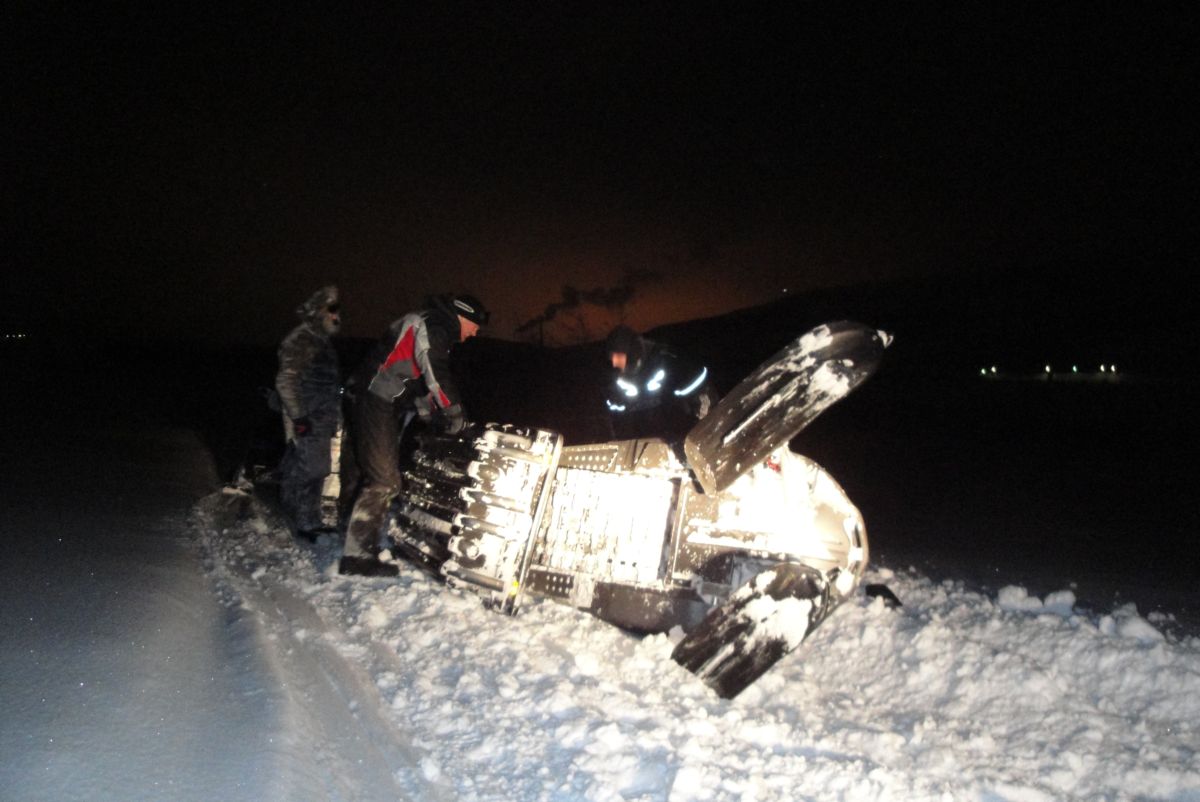 У меня на коте 19.12.10 в коробке одна железка открутилась, смешно даже, америкосы поленились ее на фиксатор резьбы посадить, ну да поняли это когда коробку разобрали,а в тот день в поле оставили снеж за воохранкой, обратно через 3 часа едем уже люди любопытствующие подъехали, стоит снежек один посреди тундры, любопытно, помогли нам его правда в пену закинуть, за что им респект, вот так тащили, разок упал правда, но без последствий: