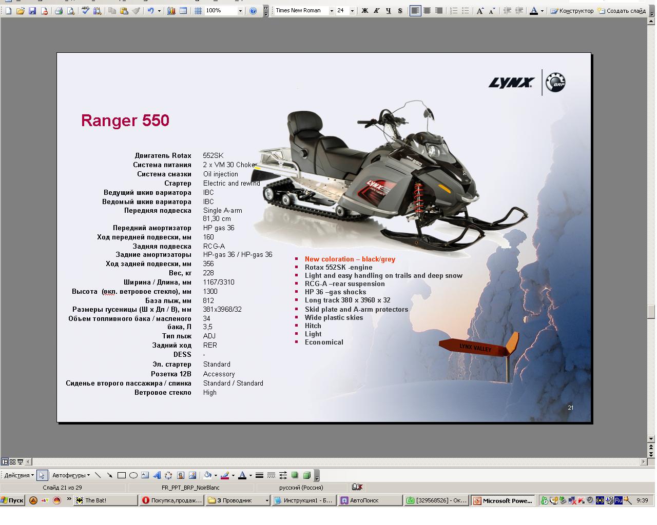 Продам снегоход Bombardier Lynx Ranger 550, 2009 года, 100%, 60 л.с., гуска 395х40, горный строп и горная проставка, фаркоп. К снегоходу отдам расширители лыж, запасной ремень, шлем с подогревом и маской. На снегоходе стоит тахометр, в базе не было, брал отдельно. Стоит 370 тысяч, продаю по себестоимости, привозил из Москвы, через таксопарк. Снегоход новый, пробег 70 км. Продаю по причине покупки квартиры (не хватает). Снежик находится в Усть-Омчуге, если будете брать, могу привезти в Магадан. Тел. 89248510500. это такой или нет? -------------------- Спасибо! — Aleks_Vl