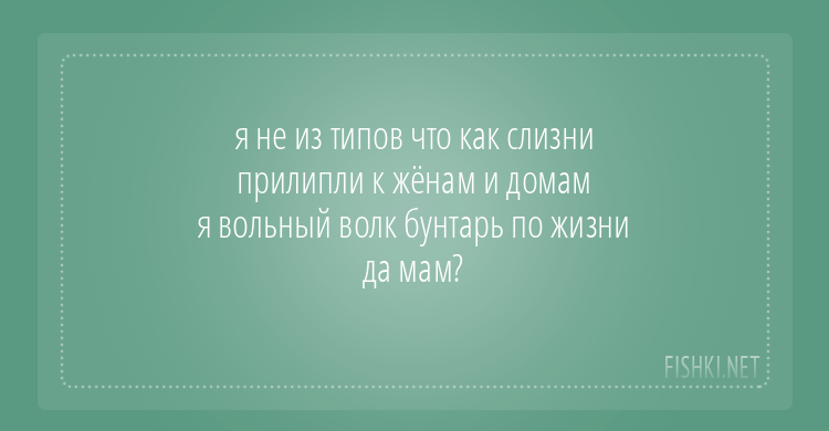 не надо делать мне как лучше, оставьте мне как хорошо я не хотела вас обидеть, случайно просто повезло, поскольку времени немного, я вкратце матом объясню, башка сегодня отключилась, не вся, конечно, – есть могу следить стараюсь за фигурой, чуть отвлекусь - она жуёт шаман за скверную погоду недавно в бубен получил всё вроде с виду в шоколаде, но если внюхаться - то нет ищу приличную работу, но чтоб не связана с трудом мои намеренья прекрасны, пойдёмте ,тут недалеко я за тебя переживаю - вдруг у тебя всё хорошо держи вот этот подорожник - щас врежу, сразу приложи я понимаю что вам нечем, но всё ж попробуйте понять мы были б идеальной парой, конечно, если бы не ты как говорится, всё проходит, но может кое что застрять, кого хочу я осчастливить, тому уже спасенья нет, звони почаще – мне приятно на твой "пропущенный " смотреть зачем учить нас, как работать, вы научитесь, как платить характер у меня тяжёлый, всё потому, что золотой чтоб дело мастера боялось, он знает много страшных слов вы мне хотели жизнь испортить? спасибо, справилась сама |