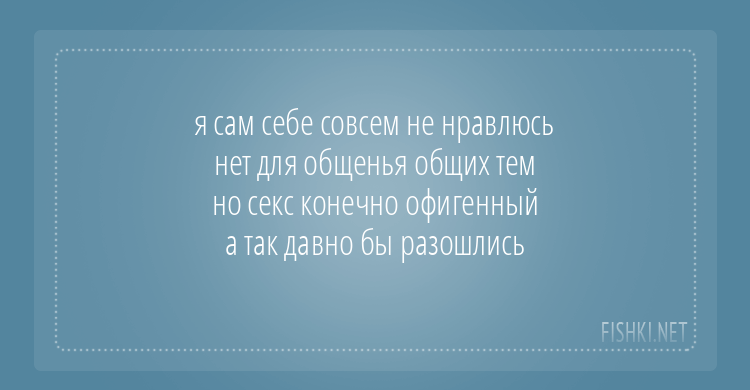 😂 - Сейчас 90% мужиков - как бабы....Первая пиши, первая звони, первая извинись... Мужики, да вообще не парьтесь! Я еще могу заехать и цветы подарить... 😂 - На вопрос: "Сколько у тебя мужиков?" отвечаю честно, положа руку на сердце: "Ни одного!!! Зато мудаков...до ебени фени". 😂 - Мне бабушка говорила - никогда не ложись с мужчиной полностью голой! Третий день ложусь спать в шляпе...Сегодня он спросил - не было ли в семье е@анутых... 😂 - В том возрасте, в котором мужик понимает, что нужно заводить семью, баба понимает, что очень даже неплохо быть одной. 😂 - Пришел домой пораньше, в комнате незнакомый мужик, ну я его табуреткой по башке. Оказался электрик...теперь дома темно, а в камере уголовники зовут меня "Выключатель". 😂 - Пишу подруге: "37,5. Все болит". Она: "Могла бы и покороче найти". 😂 - Наблюдала в очереди за кофе, маленькая девочка обнимает отца и говорит: "Я люблю тебя", а он спрашивает: "Ты опять вытираешь об меня руки?". Девочки с рождения хитрожопенькие. 😂 - Малыш и Карлсон, Дядя Федор и Кот Матроскин, Винни Пух и Кролик...Смотришь на них и понимаешь: залог крепкой дружбы - когда у одного есть что пожрать. 😂 - В конце каждой пьянки, на кухне всегда остаются два человека, которые разговаривают о смысле жизни... 😂 - Иногда приходится быть скромной, спокойной и уравновешенной. Издевательство, бл@дь, какое то. 😂 - Всем нравятся маленькие котята, маленькие щенята, маленькие цыплята и утята... И только маленький писюн не нравится никому... 😂 - Давай улетим? - Самолет или коньяк? 😂 - А вы моё письмо разве не получили? - Да кто ж твой почерк разберёт?! Мы носили его в аптеку расшифровывать, нам феназепам выдали! 😂 -------------------- Без запретов и следов,