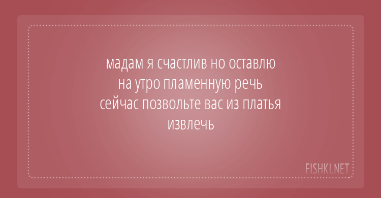❄Как жаль, я Вам теперь не по карману… ❄Ты шкаф большой, но антресоль пустая. ❄Вы с этим умным видом даже спите? ❄Гляжу, Вы лирик с матерным уклоном… ❄А в письмах Вы казались мне стройнее… ❄"Нахал!”- совсем не значит “Прекратите!» ❄Да, ты по-крупному умеешь мелочиться… ❄Наш кот не гадит в туфли – он брезгливый. ❄Быть честным хочется… Но меньше, чем богатым. ❄Честь девичью блюла. Но не со всеми. ❄И жить не хочется, и застрелиться лень… ❄К чему Вам в вашем возрасте здоровье? ❄Как говорится, победителей не садят… ❄Не надо инсценировать раздумья. ❄Сейчас я расшатаю Вам здоровье! ❄Украсьте мир отсутствием своим… ❄О, как не вовремя порой приходит время! ❄А быть моим врагом — врагу не пожелаю! ❄Хотел уж уходить, но тут опять налили. ❄Ты думал? А Минздрав предупреждал… ❄Ты правда глупый или это имидж? ❄Я от судьбы уйти хотела. Не судьба. ❄Еще вчера сегодня было завтра. ❄У нас была лишь сотовая связь. ❄Я всё отдам, но где мне это взять? ❄Путь к сердцу на желудке оборвался. ❄Идут года, мне все еще за тридцать… ❄Я выгляжу неплохо, но не часто. ❄Я стою дорого, особенно в одежде. ❄Какие это деньги? Это сдача!!! ❄Я сражена… Не наповал, но на пол. ❄Мужчины косяком — и мимо, мимо… ❄Ума палата с крышей набекрень. ❄Зачем мне талия? Я замужем теперь! ❄Жизнь — это дар. Но лучше бы деньгами. ❄Как идиот, Вы были безупречны. ❄Я в браке третий раз. Опять попался брак… ❄Нет вкуса? У меня?! А вы лизните! ❄Я всех умней, но это незаметно. ❄Хотелось бы кому-нибудь хотеться… ❄Гиппопотам – как много в этом звуке! ❄Национальность у меня не очень… ❄Не вас ли стриг безрукий парикмахер? ❄Хотелось бы чуть-чуть всемирной славы… ❄Под шубой оказалась не селедка. ❄"Ты действуй. Я посплю,” – сказала совесть. ❄Да, я не пью, но я не пью не это. ❄Всей правде обо мне прошу не верить. ❄Забудь меня. Сожги мои расписки. ❄Люблю тебя как брата. Но чужого ... ❄Два дня не сплю, не ем уже три ночи… ❄Упал кирпич на голову. К чему бы? ❄Печальный взгляд… Вы не сексопатолог? ❄Ну что тебе сказать о логарифмах?.. ❄Бежать за пивом помешали ноги. ❄И все б сбылось!… Но зазвонил будильник. ❄Что исправлять! Меня уже родили… ❄Твои б мозги да к моему диплому!.. ❄Верна троим. Но не предел и это. ❄Я проверялcя. Вы больны не мною. ❄Тефтеля – это вам не фунт изюма! ❄Вы идиот?! Нет, нет, не отвечайте!.. ❄Я честь отдам, но большего не требуй… ❄Теперь о вечном. Вечно ты поддатый! ❄Ребенок мой. Хотя подпорчен школой… ❄При Брежневе и я была невинна… ❄Вот это вот зарплата?! Не похожа… ❄Да вы пьяны! Причем который месяц! ❄Я ухожу! По сокращенью штатов. ❄Свое еврейство доказал наглядно… ❄Хранила верность в силу обстоятельств… ❄Ну, раз послали в жопу, заходите… ❄Нет, что вы, я не замуж, я по делу… ❄Да бросьте: “врач, не врач…” Вы - раздевайтесь! ❄Какая ночь! Пора предохраняться. ❄При слабонервных я не раздеваюсь. ❄Я замужем. Давно и безответно. ❄Сегодня дел полно! Во-первых, завтрак… ❄И в пятый раз… Так я ли всех прекрасней? ❄А ты-то почему меня не хочешь? ❄Сударыня!.. (Все. Дальше нецензурно.) ❄Любуйся мной. Правее… Вон оттуда. ❄IQ хорош, но мог бы быть трехзначным… ❄Чего б еще разумного посеять? ❄Стихи пишу не в стол, а сразу в урну. ❄Лень продолжать. Пусть будет одностишье… ❄Заслушался, мадам, как вы молчите. ❄Пойду-ка эрудицию нагуглю. ❄О холодильник! Лидер по просмотрам! ❄Коль что-то не сложилось – в