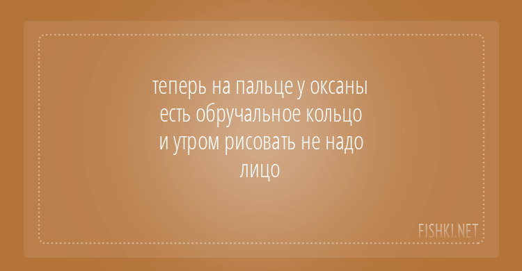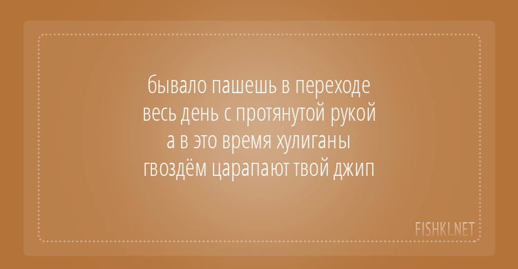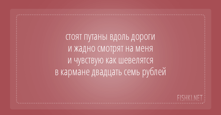 как ни подбирал я цвет размеры вес не торгуют счастьем на али экспресс *** где ж ты мой желанный долгожданный секс с женщиной красивой можно даже без *** бегаю по парку голый но в плаще потому что бабы не дают ваще *** горьковато сладкий привкус белены николай приехал к тёще на блины *** обожаю чипсы тапки и носки разбросать повсюду хаотически *** что ж с меня квартира пиво и бифштекс приходите в восемь приносите секс *** хочется влюбиться чтоб души полёт только муж вот против говорит прибьёт *** мне бы тоже в небо вслед за птицами но куда с такими ягодицами *** хороша тамара в ближнем свете фар но увы не держит лобовой удар *** у кощея в утке спрятано яйцо там оно целее и не чешецо *** Сообщение отредактировал Юлия - 22.3.2017, 11:59 -------------------- |
