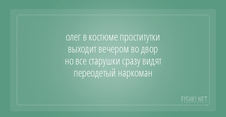 её сбил конь средь изб горящих, она нерусскою была, когда все крысы убежали, корабль перестал тонуть дела идут пока отлично, поскольку к ним не приступал, работаю довольно редко, а недовольно каждый день была такою страшной сказка, что дети вышли покурить когда на планы денег нету, они становятся мечтой женат два раза неудачно - одна ушла, вторая – нет уж вроде ноги на исходе, а юбка всё не началась я попросил бы вас остаться , но вы ж останетесь, боюсь для женщин нет такой проблемы, которой им бы не создать Олегу не везёт настолько, что даже лифт идёт в депо меня запомните весёлым, а завтра я начну ремонт зевну ,укроюсь с головою, будильник заведу на март мы называем это жизнью, а это просто список дел всё то, что нас не убивает, богаче делает врачей и жили счастливо и долго... он долго, счастливо она я не туплю, а экономно расходую потенциал мне психиатр сказал: присядьте, щас успокоюсь и начнём в народ ходили депутаты лишь только по большой нужде сержант почти поймал бандита, но тот по званью выше был в постели ты великолепен, все две минуты просто бог пришла ко мне сестра таланта, но не достала до звонка я ненавижу власть и деньги, когда они в чужих руках Андрей весь день крутил баранку, потом не выдержал и съел |