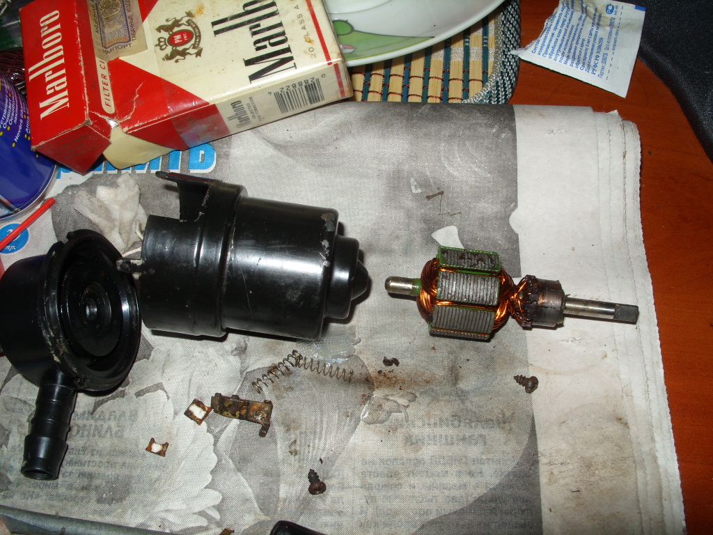 этой зимой дошли руки разобрать. инструмент: отвертки крестовые и простые(одна шириной 8-9 мм), ВД-40(очень много), паяльник, тряпка, чуть солидола, тестер, плоскогубцы (с не очень широкими рабочими поверхностями), шприц откручиваем2 болта бачка омывателя. можно снять а можно и не снимать фишки с омывателя стекол. со снятыми удобнее. снизу бачка обнаружите крупный такой насос.откручиваем хомут крепления, снимаем шланг и вытаскиваем насос из бачка. отсоединяем фишку его питания отгибаем три усика на корпусе и отсоединяем насос. остается стальной корпус в который вставлена пластмасовая заглушка из которой торчит вал и провода. в этой крышке есть дренажное отверстие. в него заливаем около 2 куб.см. ВД -40 при помощи шприца. и обильно поливаем крышку сверху и отверткой пытаемся отогнуть буртик корпуса от пластмасовой крышки чтобы туда попала ВД-40. повторяем,повторяем и еще много раз. у меня этот этап знял минут 25-30. тепер пробуем поддеть широкой отверткой крышку в месте где в нее входят провода. если крышка пошла хоть на полмилиметра( у меня удаль поднять ее заподлицо с корпусом) то берем плоскогубцы и держа ими внутреннее кольцо крышки начинаем пытаться вытянуть крышку, при этом передвигая плоскогубцы по внутреннему кольцу, чтобы крышка вылазила как можно равномернее и не перекашивалась. сняв крышку смотрим внутрь. у меня иам КУЧА грязи которая наросла на ротор и аж заклинилась между магнитами. а на магнитах грязи столько что не видно было борозды которая их отделяет. щетка одна вылетела из своего гнезда. вымываем все, вычищаем,соскабливаем с поверхности ротора грязь, вытираем магниты от всего мусора. окручиваем пластину на которой стоят щетки и избавляемся от теплового реле(к этому времени оно обычно уже не работает, да и практика показала что и без него все работает норм.). это такой прямоугольничек над одной из щеток. короче наша задача чтобы от одного провода ток шел на одну щетку а от другого на другую и посредников чтобы не было. выламываем реле и к оставшимся контактам, или сразу от провода к корпусу щетки припаеваем кусок провода. на первом фото видно что осталось от реле над левой щеткой.проверяем тестером сигнал от щетки до штекера.ставим пластину на место. ставим на место щетки. фиксировать щетки удобно скрепками канцелярскими. делаешь из скрепки петельку, хватаешь ей провод щетки и прижимаешь его к стенке. смазываем литолом вал ротора и вставляем ротор в крышку. с лицевой стороны крышки держим вал чтобы он не мог вылезти из крышки, так как при дальнейшей сборке магниты сильно тянут вал и он выскакивает и сним вместе щетки. ставим крышку с ротором в корпус мотора. вал там отцентруется сам. ставим насос, обжимаем три усика. проверяем. все должно работать. ставим насос на место в обратном порядке. в путь Сообщение отредактировал keribas - 15.3.2010, 0:44 -------------------- А У НАС ВСЕ ПУЧКОМ!!!