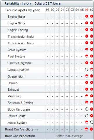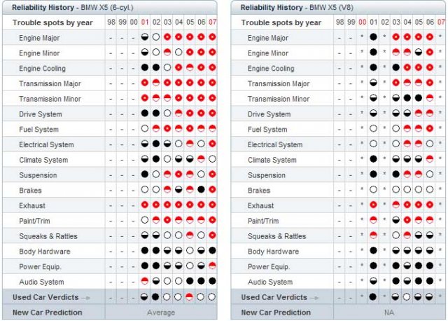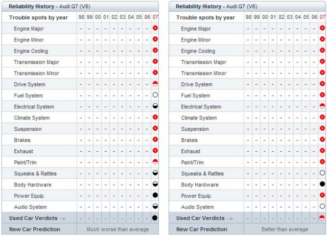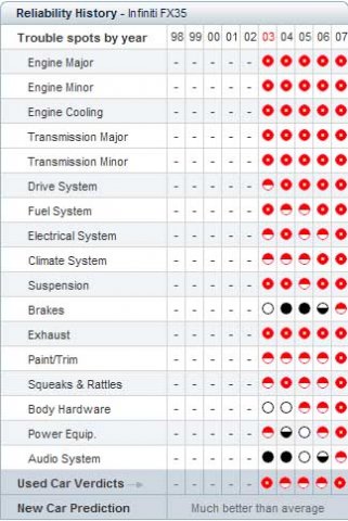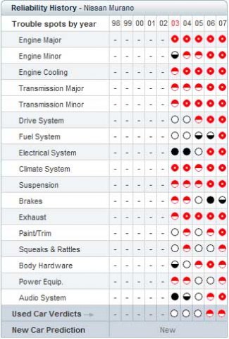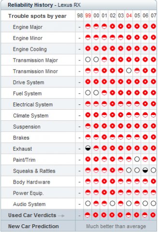 Данные по надежности из журнала Consumer Reports(собираемой на основании отзывов читателей о своих машинах) Белый кружок- средняя надёжность, красный- очень надёжный, чёрный не надёжный, промежуточные значения соответственно выше или ниже среднего. Выбор очевиден. Сообщение отредактировал Leon - 2.6.2010, 13:00 |