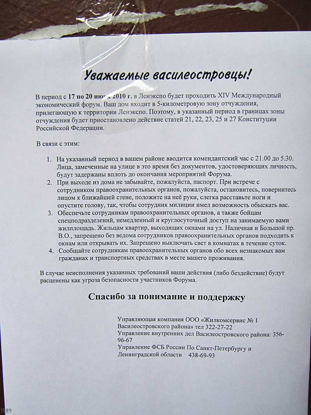 Власти Петербурга назвали фальшивкой объявления о комендантском часе на время экономического форума время публикации: 21 июня 2010 г., 22:11 последнее обновление: 21 июня 2010 г., 22:11 В Петербурге неизвестные "шутники" попытались вызвать волну народного гнева против властей, распространив фальшивые объявления о мерах безопасности на время Международного экономического форума. В этом году он состоялся 17-19 июня и традиционно прошел в выставочном комплексе "Ленэкспо" на Васильевском острове. Фотокопии объявлений, написанных якобы от имени управляющей компании "Жилкомсервис №1" и УВД Василеостровского района, а также Управления ФСБ по Санкт-Петербургу и Ленобласти, были распространены блогерами в интернете, а вслед за ними "новость" подхватили некоторые СМИ, прежде всего, местные. Ознакомиться с содержанием этой провокативной "листовки" можно, к примеру, в ЖЖ-сообществе питерской левопатриотической группы "Движение сопротивления имени Петра Алексеева" (ДСПА). - Нацболы встретили участников форума угрозами повтора действий "приморских партизан" В ней, в частности, сообщается, что на время форума в 5-километровой "зоне отчуждения" вокруг "Ленэкспо" прекращается действие ряда статей Конституции РФ и принимаются следующие меры: - вводится комендантский час; - милиционеры получают право обыскивать граждан, в связи с чем те при встрече с сотрудником органов должны сразу встать лицом к стене, расставив ноги и опустив голову; - правоохранители и бойцы спецподразделений получают право круглосуточного доступа в квартиры домов внутри "зоны отчуждения", жильцам запрещается подходить к окнам и открывать их, а также выключать свет в комнатах в течение суток; - граждане обязаны сообщать обо всех незнакомых лицах или транспортных средствах в районе. Разместивший фотографию блогер в комментарии называет объявление не иначе как "Страшным Свидетельством Тоталитаризма". "Мы представляем вам возможность самим увидеть этот чудовищный документ эпохи, и оценить весь ужас и безысходность своего положения", - пишет активист ДСПА, утверждая, что такие листовки были развешаны на подъездах домов по всему району. Судя по всему, эта фальшивка, ставшая в итоге провокацией, замышлялась как пародия на настоящие объявления, которые действительно вывешивал "Жилкомсервис №1". Одну из них сфотографировали журналисты "БалтИнфо". Она гласит, что жителям домов в "500-метровой зоне ограниченного доступа вокруг "Ленэкспо" необходимо иметь при себе паспорта, приезд гостей заранее согласовывать с участковым и сообщать в управляющую компанию или по телефону 02 об открытых чердаках, подвалах, оставленных пакетах и посторонних гражданах". Безусловно, и это объявление вызывает некоторые вопросы, однако описанные в нем меры все же больше похожи на российскую действительность, чем перечисленные в фальшивке. Шум, поднятый в блогах и СМИ по поводу этих листовок, заставил "Жилкомсервис №1" дать официальный комментарий. В понедельник управляющая компания заявила через "Интерфакс", что не имеет отношения к объявлениям о комендантском часе и прочих "драконовских мерах" на время Международного экономического форума. "Мы не рассылали и не расклеивали такую листовку. Наши объявления, которые мы распространяли, совсем другого содержания. Возможно, это кто-то так пошутил", - сказали агентству в
