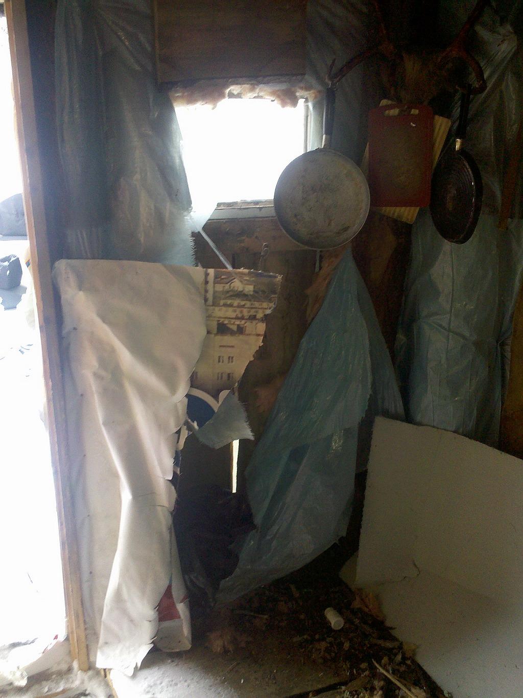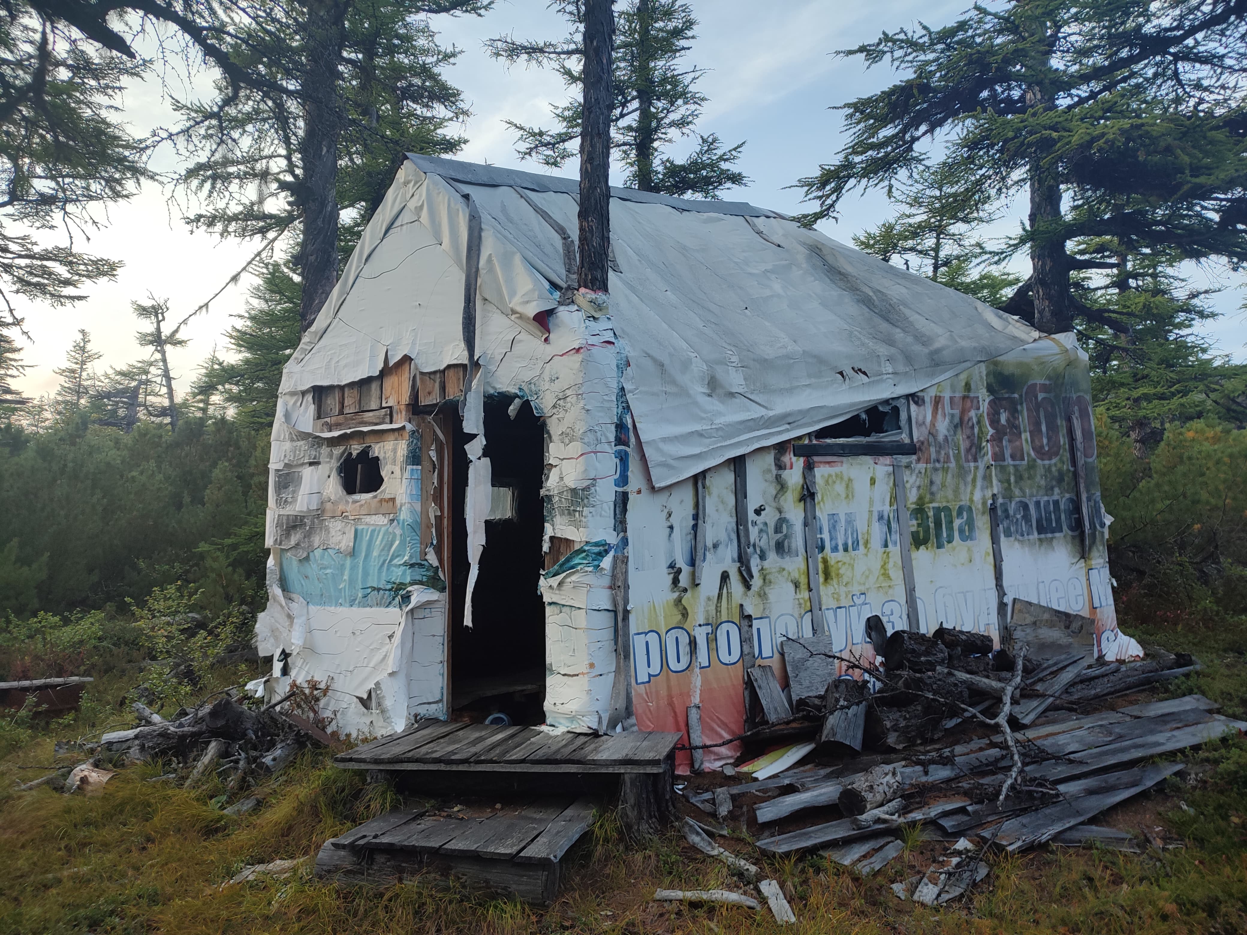 По пути на Оксу заехали к Фигваму, проведали. Признаться, это первый мой визит туда с новогодних каникул 11 года... Состояние строения именно такое, в каком он был после последних забитых гвоздей и летнего визита медведя. Мне показалось, что он мышь по дому гонял, потому и угол разорвал. Только вот лавку внутри я не обнаружил, ее не выносили на улицу?