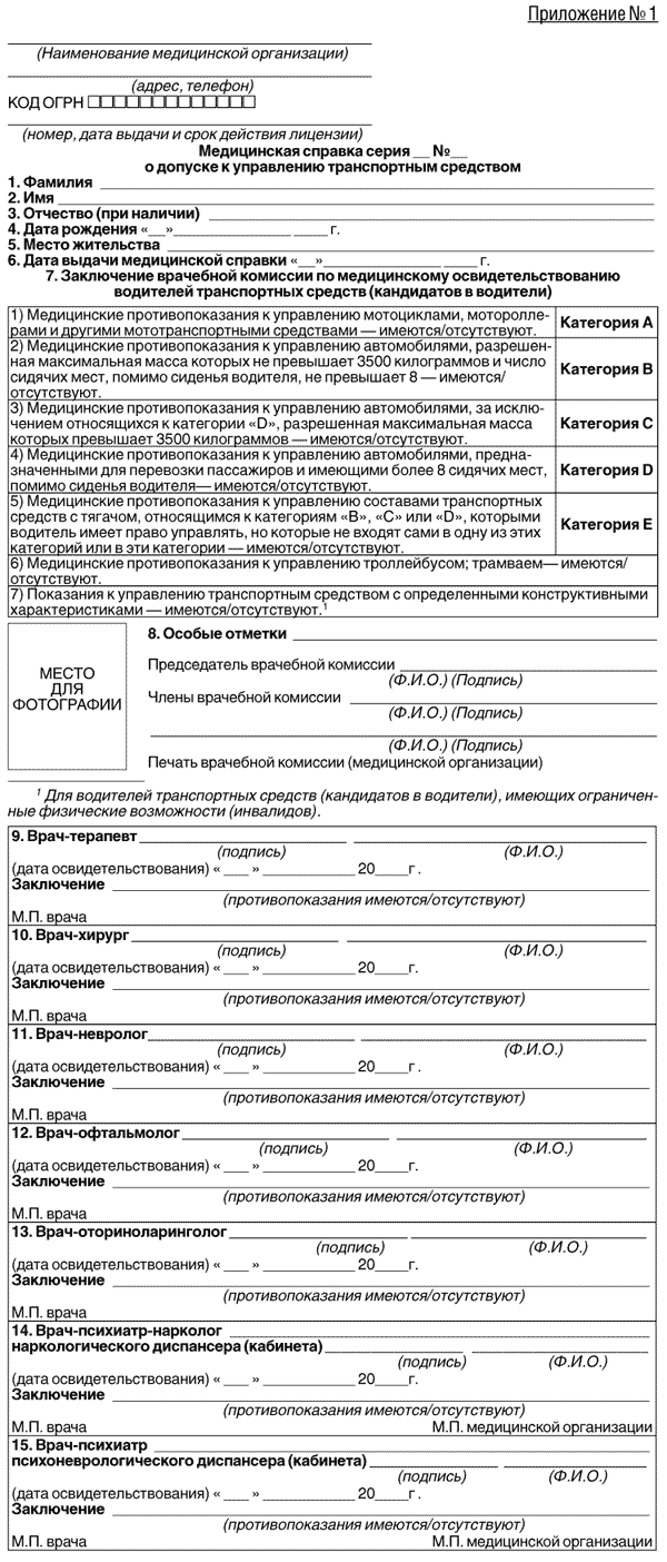 (Минздравсоцразвития России) от 28 сентября 2010 г. N 831н г. Москва ”Об утверждении единого образца Медицинской справки о допуске к управлению транспортными средствами” Опубликовано 27 октября 2010 г. ссылка доступна только зарегистрированным Зарегистрирован в Минюсте РФ 21 октября 2010 г. Регистрационный N 18784 В соответствии с пунктом 5.2.100.1 Положения о Министерстве здравоохранения и социального развития Российской Федерации, утвержденного постановлением Правительства Российской Федерации от 30 июня 2004 г. N 321 (Собрание законодательства Российской Федерации, 2004, N 28, ст. 2898; 2005, N 2, ст. 162; 2006, N 19, ст. 2080; 2008, N 11, ст. 1036; N 15, ст. 1555; N 23, ст. 2713; N 42, ст. 4825; N 46, ст. 5337; N 48, ст. 5618; 2009, N 2, ст. 244; N 3, ст. 378; N 6, ст. 738; N 12, ст. 1427, ст. 1434; N 33, ст. 4083, ст. 4088; N 43, ст. 5064; N 45, ст. 5350; 2010, N 4, ст. 394; N 11, ст. 1225; N 25, ст. 3167), пунктом 5 Плана реализации мероприятий по совершенствованию порядка исполнения государственных функций и процедур, связанных с приемом квалификационных экзаменов на получение права на управление транспортными средствами и выдачей водительских удостоверений, утвержденного распоряжением Правительства Российской Федерации от 15.07.2010 N 1174-р (Собрание законодательства Российской Федерации, 2010, N 29, ст. 3973), приказываю: 1. Утвердить: единый образец Медицинской справки о допуске к управлению транспортными средствами согласно приложению N 1; инструкцию по заполнению Медицинской справки о допуске к управлению транспортными средствами согласно приложению N 2; форму статистического учета N 036-10/у-10 ”Журнал регистрации выданных медицинских справок о допуске к управлению транспортными средствами” согласно приложению N 3. 2. Установить, медицинская справка о допуске к управлению транспортными средствами является защищенной полиграфической продукцией со степенью защиты уровня ”В”. Министр Т. Голикова Приложение N 2 Инструкция по заполнению медицинской справки о допуске к управлению транспортными средствами 1. Медицинская справка (далее - Справка) заполняется медицинским работником при предъявлении гражданином паспорта или иного заменяющего его документа, удостоверяющего личность. 2. Записи в Справке вносятся на русском языке чернилами или шариковой ручкой синего, фиолетового или черного цвета, либо с применением печатающих устройств. 3. В левом верхнем углу Справки проставляется полное наименование медицинского учреждения в соответствии с документом регистрационного учета, код ОГРН, почтовый адрес и телефон, вносятся сведения о наличии лицензии - номер, дата выдачи и срок действия лицензии по видам медицинской деятельности. 4. В строках 1, 2, 3 Справки вписывается соответственно фамилия, имя, отчество (при наличии) водителя транспортного средства (кандидата в водители), полностью без сокращений. 5. В строке 4 ”Дата рождения” указывается дата рождения водителя транспортного средства (кандидата в водители): число, месяц, год. 6. В строке 5 ”Место жительства” указывается адрес регистрации по месту жительства или по месту пребывания, либо адрес места фактического проживания водителя транспортного средства (кандидата в водители). 7. В строке 6 ”Дата выдачи медицинской справки” указывается дата выдачи Справки врачебной комиссией по результатам освидетельствования водителя транспортного средства (кандидата в водители): число, месяц, год. 8. В соответствующих строках таблицы 7