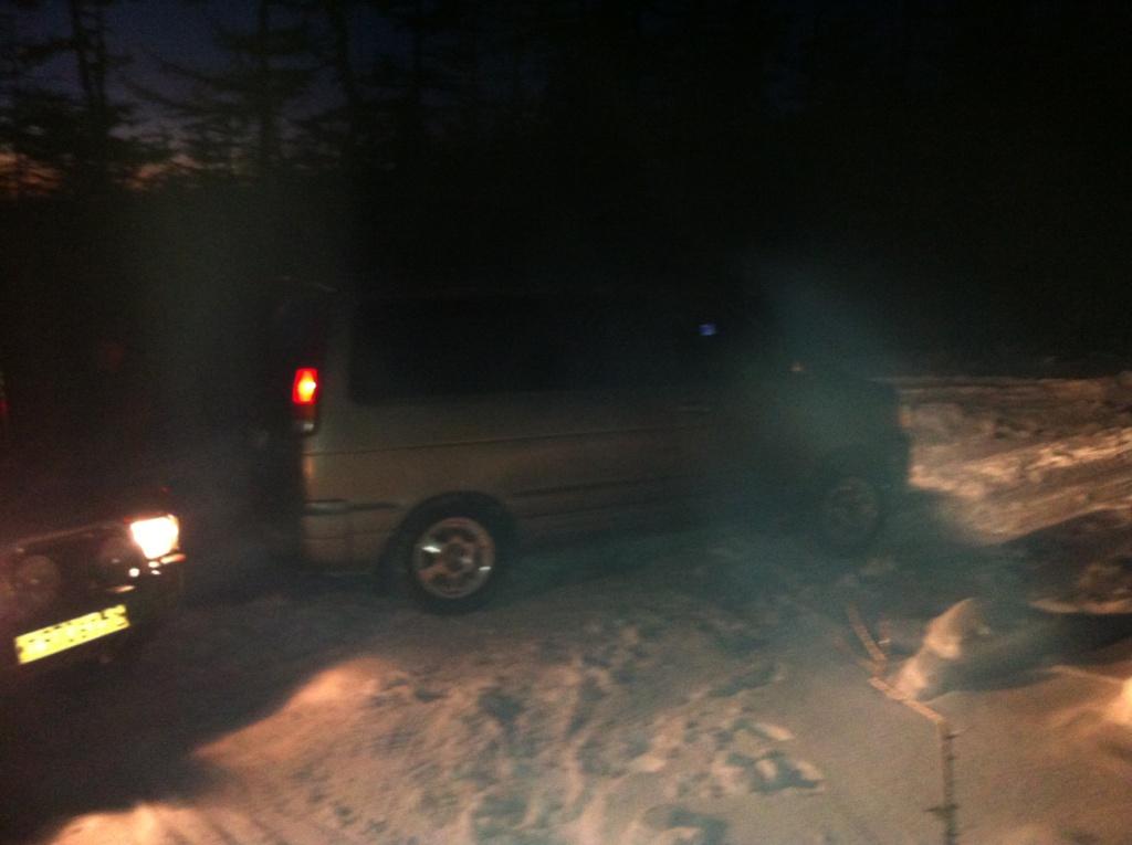 с пятницы на себботу выехали в 5 утра, благополучно догнали колонну на перевале...и там простояли 5 часов...блин просто поражает аленизм некоторых водителей!!! Один рыбак сломал ногу. в долине у Чистого термометр показал -40. Перед бухтой в наледи порвали делику, эту наледь своим ходом уже пройти никто не мог, или лебедкой или на веревке. В итоге туда 10 часов. Обратно в воскресенье после обеда, лебедка/веревка понадобилась только на одном участке на перевале. докатились за 5 часов.